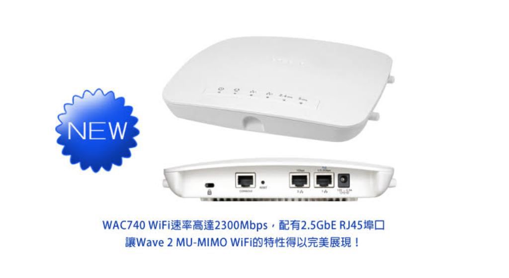 NETGEAR發表全新商用無線AP-WAC740,採用802.11ac Wave 2無線規格,可同時對多個WiFi裝置全速傳輸,並具備2.5G BASE-T連接埠,搭配同樣具備NBASE-T連接埠的NETGEAR GSM4210P交換器,即可發揮高達2300Mbps的WiFi速率!WAC740可透過PoE供電,並可外接天線來延展無線訊號的覆蓋率。