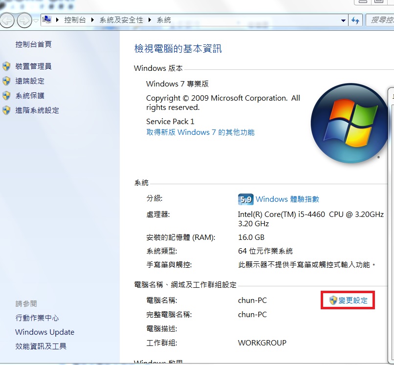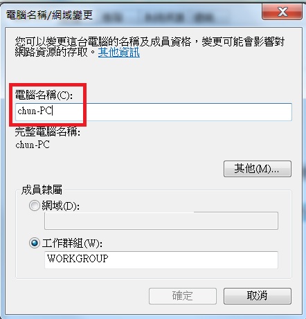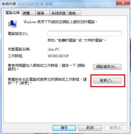 修改電腦名稱、變更網域名稱、微軟windows7範例 發佈日期: 2017-07-06 作者: tomchun ※本篇內文資訊參考如下※ - - ※更新文章日期: 2017-07-06 如何修改同一區網的電腦名稱 我的電腦右鍵內容 或是進去控制台的系統及安全性=>系統 點選右下角的變更設定 點選變更 電腦名稱進行修改 通常預設的同一區網工作群組都是workgroup 同一區網工作群組電腦名稱不能相同