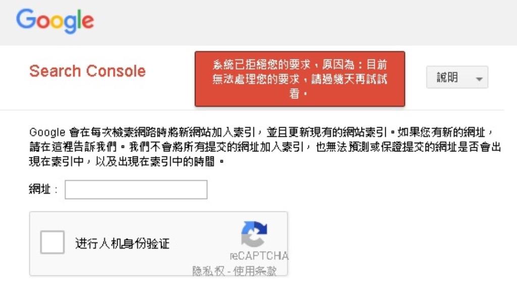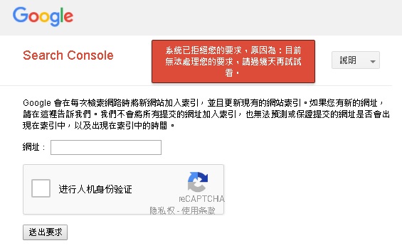 今天再提交索引網址給google搜尋引擎的時候出現錯誤