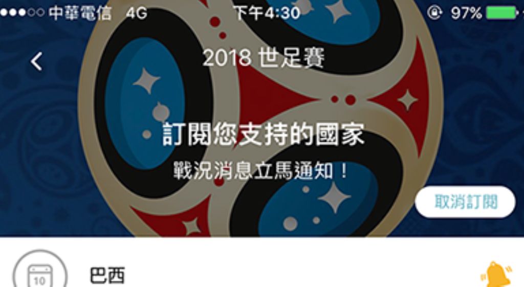 收錄世足賽熱門國家,用戶可訂閱喜愛的國家!