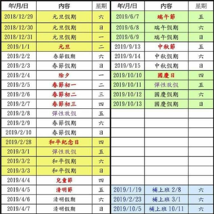 2018~2019放假日、元旦、春節、彈性假期、補上班