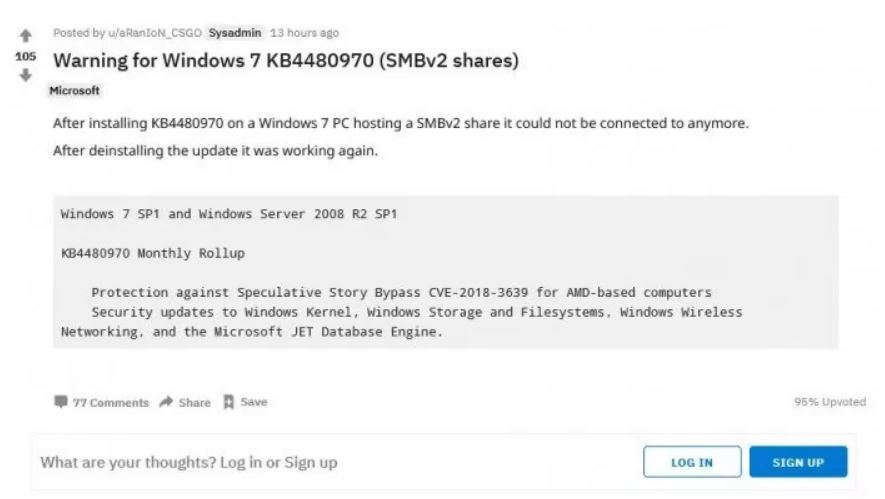 今早公司ERP遇到的狀況,爬了一下國外的文章,發現也有網友也有相同的情況(SMBv2 協定的共享資料夾網絡錯誤),去控制台找到KB4480970這個微軟更新,移除更新之後,進行系統重開機之後,就會正常找到檔案資料夾了,相同情況也發生在Windows 2008 R2系統上,有這種情況的朋友可以移除試試看,目前就只能這樣,再來就要等微軟更新補丁BUG了。