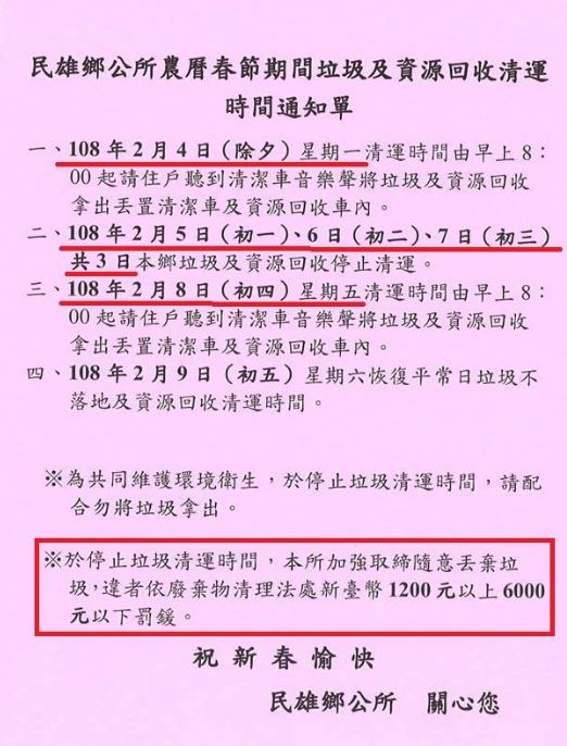 2019民雄108年春節期間垃圾車清運表、廚餘、資源回收 發佈日期: 2019-01-152019-01-15 作者: tomchun ※本篇內文資訊參考如下※ - - ※更新文章日期: 2019-01-15 2019民雄108年春節期間垃圾車清運表、廚餘、資源回收 – 📢「農曆春節」期間垃圾清運時間異動通知 (請大家注意收垃圾、資源回收時間💥) 【2019-01-14 民雄鄉公所】