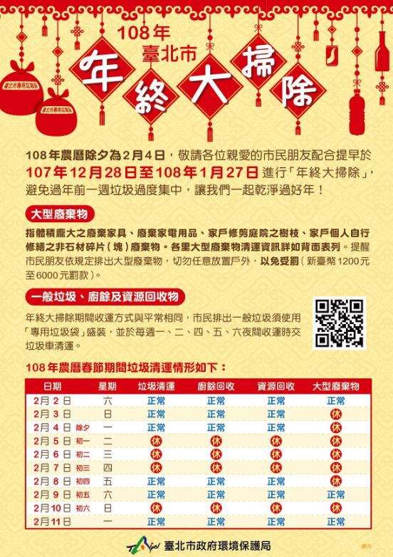 108年農曆除夕為2月4日,敬請各位親愛的市民朋友配合提早於107年12月28日至108年1月27日進行「年終大掃除」,避免過年前一週垃圾過度集中,讓我們一起乾淨過好年!