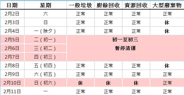 2019台北108年春節期間垃圾車清運表、廚餘、資源回收