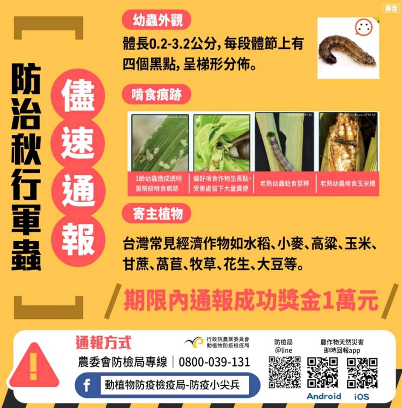 近期在臺灣發現秋行軍蟲的蹤跡,目前案例皆為幼蟲,必須要在羽化之前全面清除,一旦釀成災情,會造成臺灣重大損失,政府已建立補償及獎勵措施辦法,發現疑似的個體,立刻通報,如在期限內通報成功獎金10,000元,大家一起抓蟲蟲,拿獎金