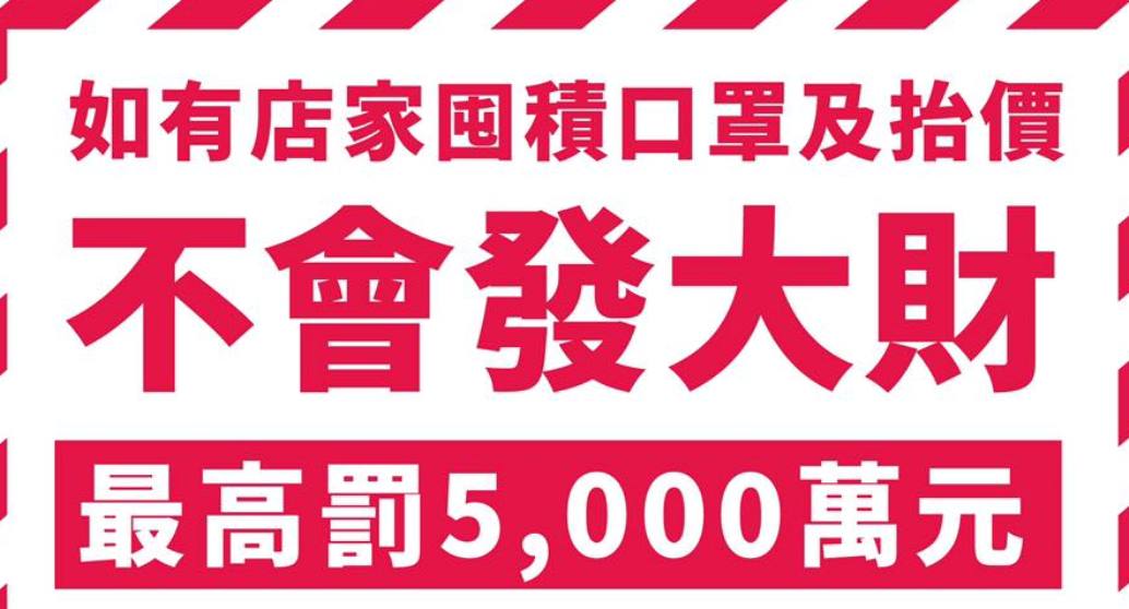 如有店家囤積口罩及抬價,不會發大財,最高罰5000萬,請撥打檢舉專線1950(下圖)