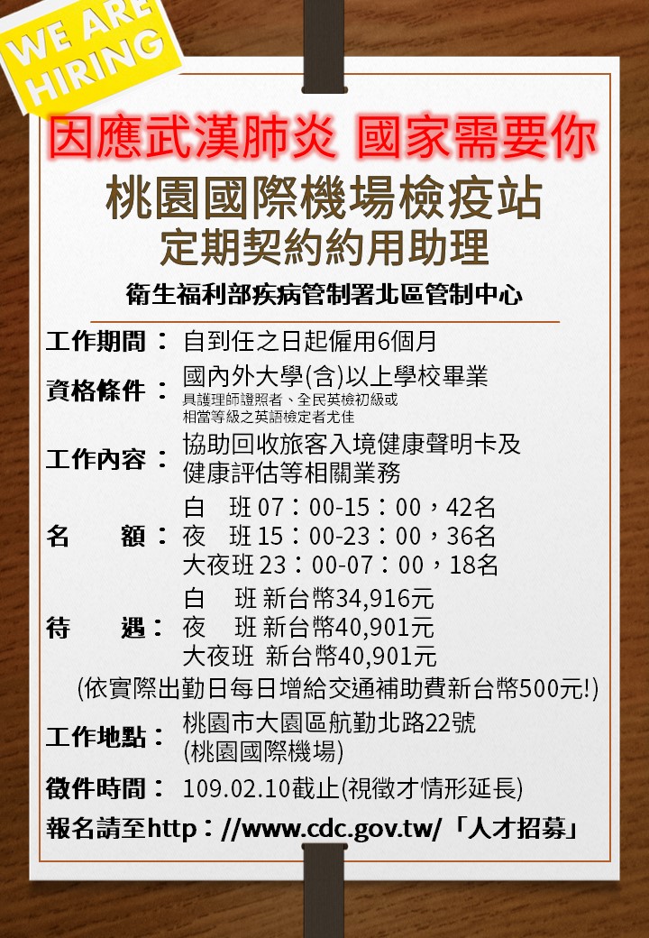 桃園國際檢疫站招募定期契約約用助理