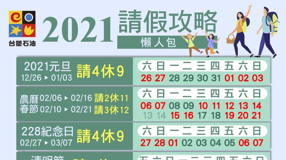 2021農曆春節、元旦、節慶、請假攻略圖表、連休、休假懶人包 發佈日期: 2020-12-092020-12-09 作者: tomchun ※本篇內文資訊參考如下※ - - ※更新文章日期: 2020-12-09 2021請假攻略圖表、連休、休假懶人包 @!台塑石油 元旦 農曆春節 228紀念日 清明節 端午節 中秋節 國慶日 2022元旦
