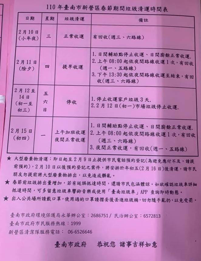 2021台南新營垃圾車過年春節回收清運時間地點110年日期表