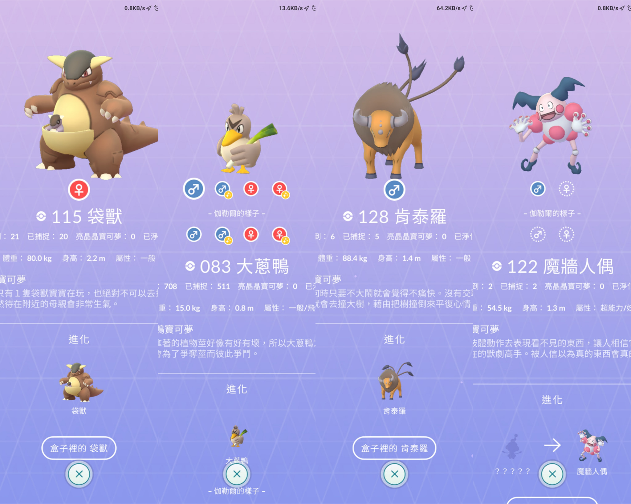 大蔥鴨、肯泰羅、魔牆人偶、袋獸將在GO Tour團體戰登場! 發佈日期: 2021-02-202021-02-20 作者: tomchun ※本篇內文資訊參考如下※ - - ※更新文章日期: 2021-02-20 大蔥鴨、肯泰羅、魔牆人偶、袋獸將在GO Tour團體戰登場! 精靈寶可夢 Pokemon Go@林哲弘寶友分享 據可靠消息指出!! 下列地區限定寶可夢(大蔥鴨、肯泰羅、魔牆人偶、袋獸) 將在GO Tour活動中限時於團體戰登場! 活動時間:2/20 9:00-21:00 #全體玩家都有 #有機會開到色違