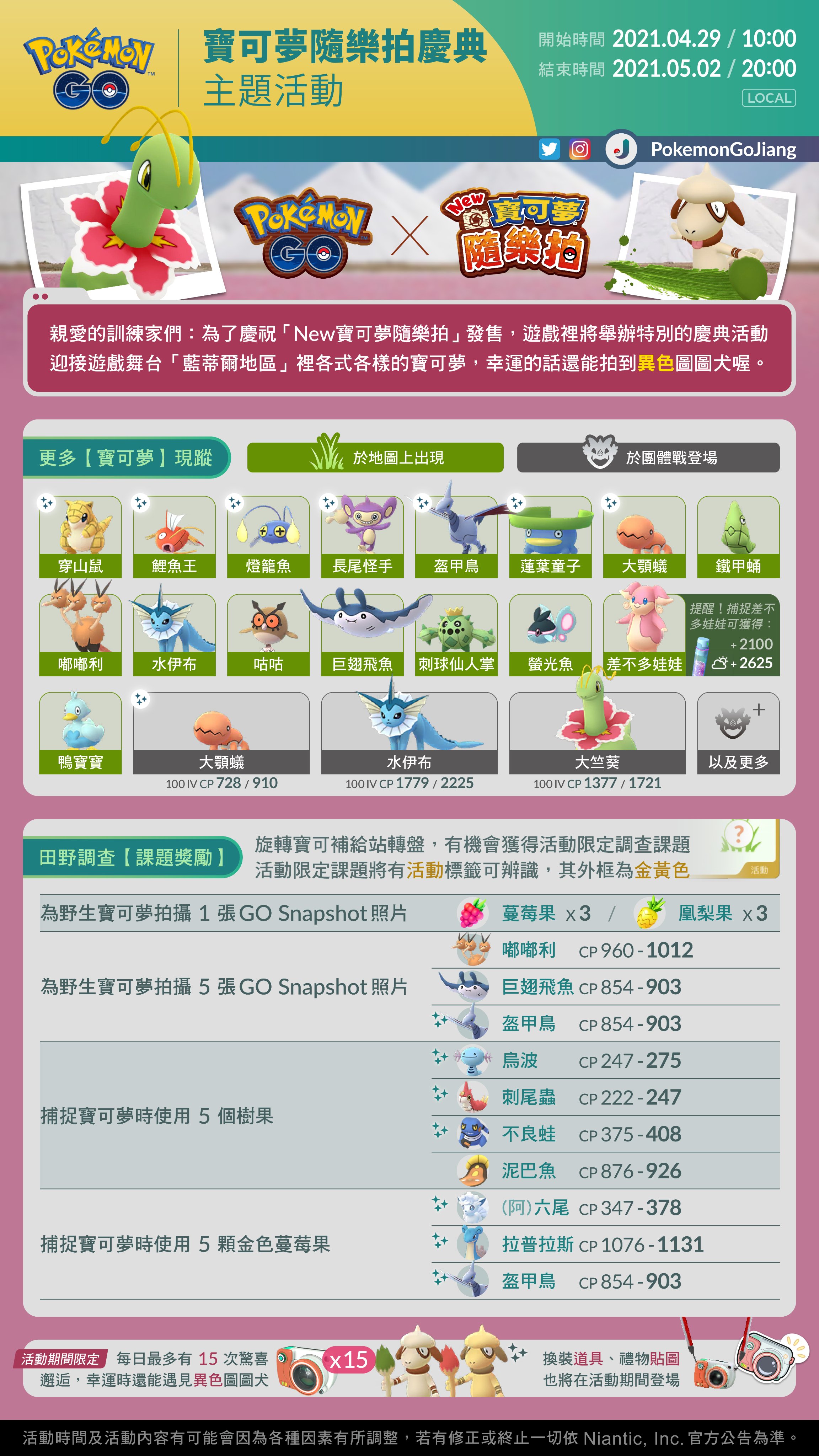別忘了在社群媒體上貼文,並加上 #GOsnapshot 主題標籤來分享你的精彩冒險和照片!我們十分期待在這個活動中見證你們與寶可夢的相遇。