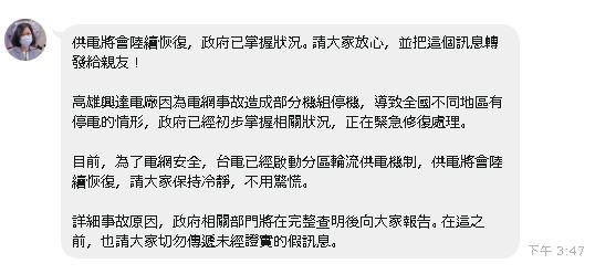 供電將會陸續恢復,政府已掌握狀況。請大家放心,並把這個訊息轉發給親友!