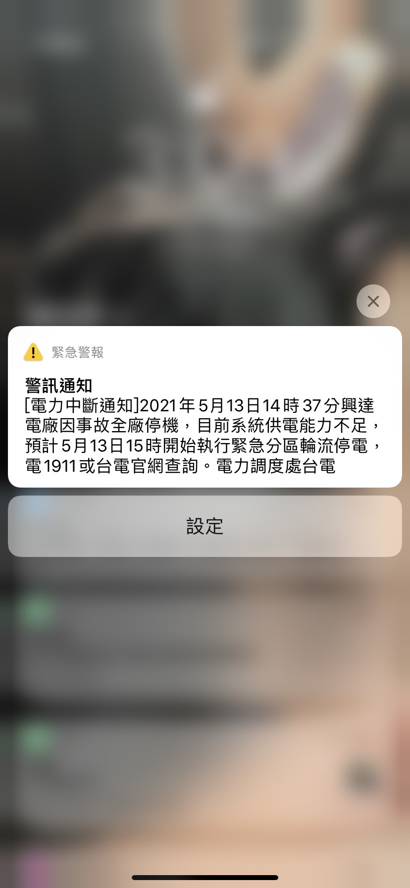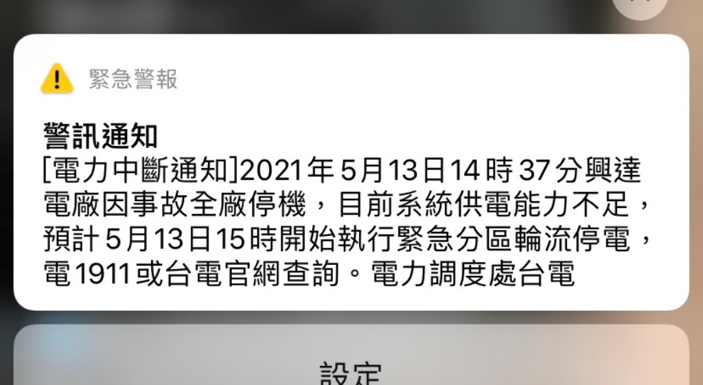 國家警報內容如下:2021年5月13日14時37分,興達電廠因事故全廠停機,目前系統供電能力不足,預計5月13日15時開始緊急分區輪流停電。民眾可電話洽1911或台電官網,查詢電力調度。