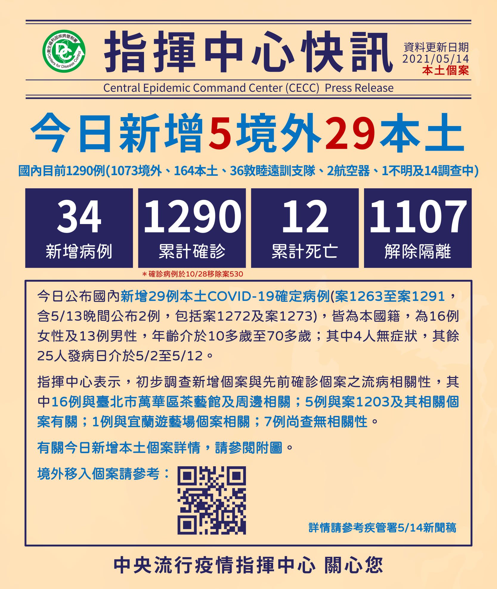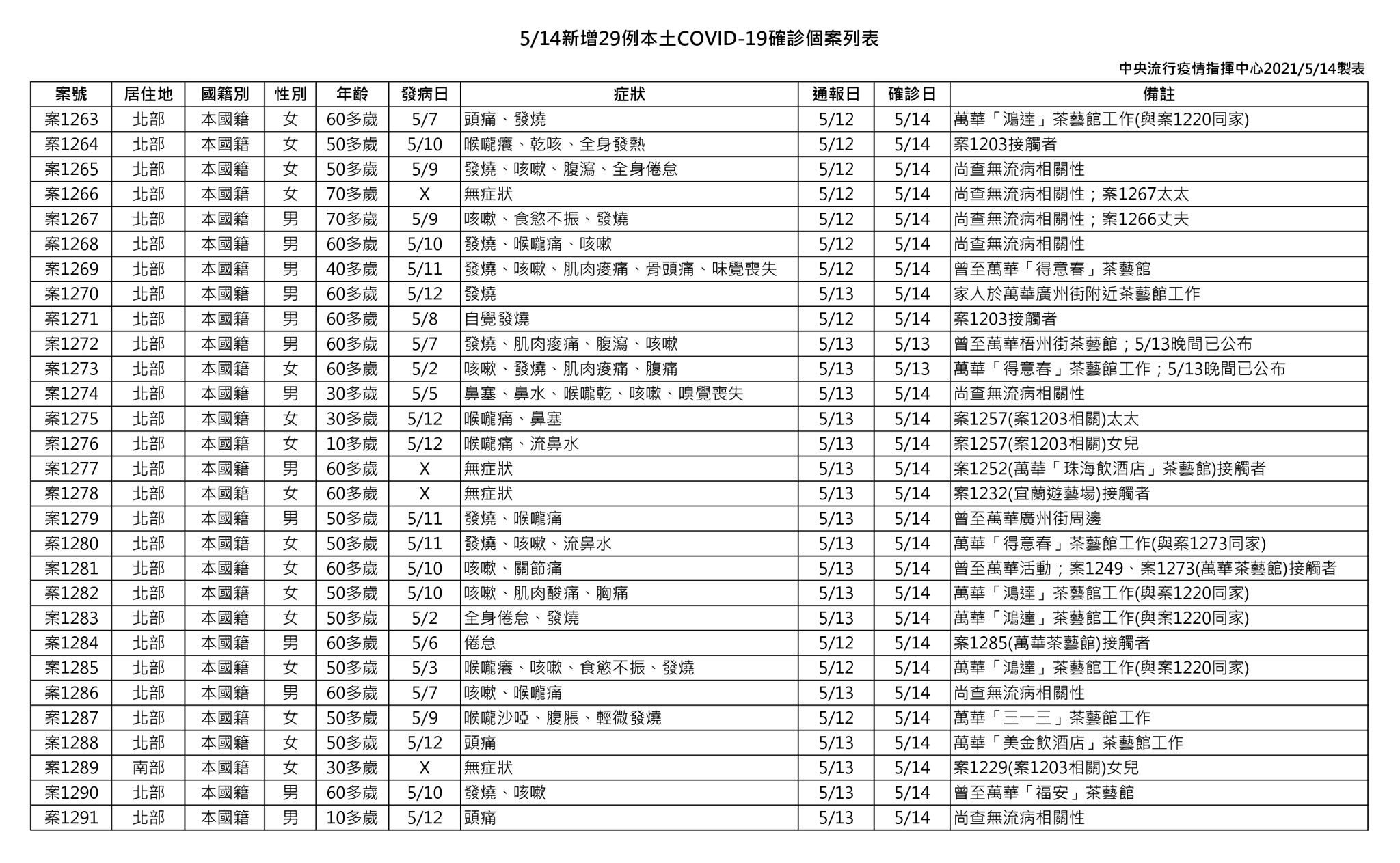 #中央流行疫情指揮中心 今(14)日公布國內新增29例本土COVID-19確定病例(案1263至案1291,含5月13日晚間公布2例,包括案1272及案1273),皆為本國籍,為16例女性及13例男性,年齡介於10多歲至70多歲;其中4人無症狀,其餘25人發病日介於5月2日至5月12日。