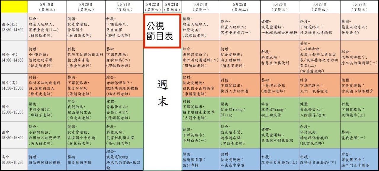 📍公視三台從明天下午開始,播出高中、國中、 國小等教學節目👉5/19-5/28共8天的課程(節目表如下圖)