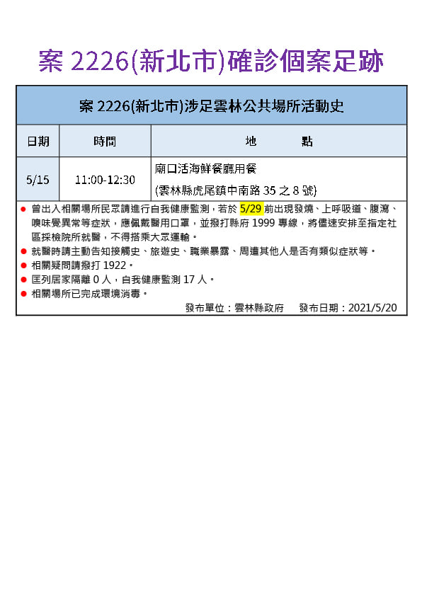 1. 2226案足跡為5/15中午11:00~12:30至虎尾用餐