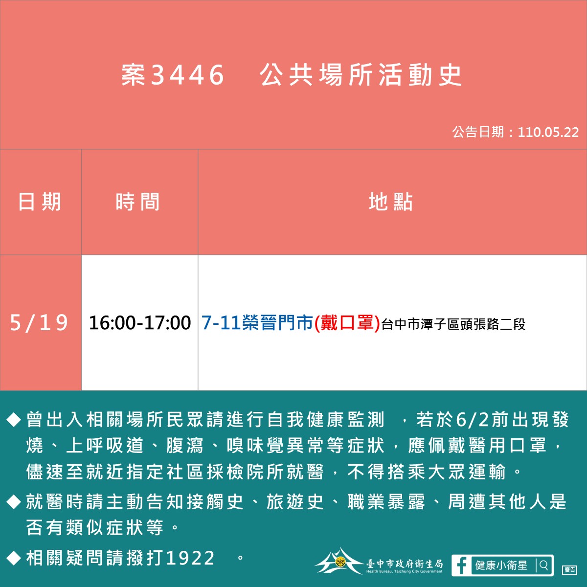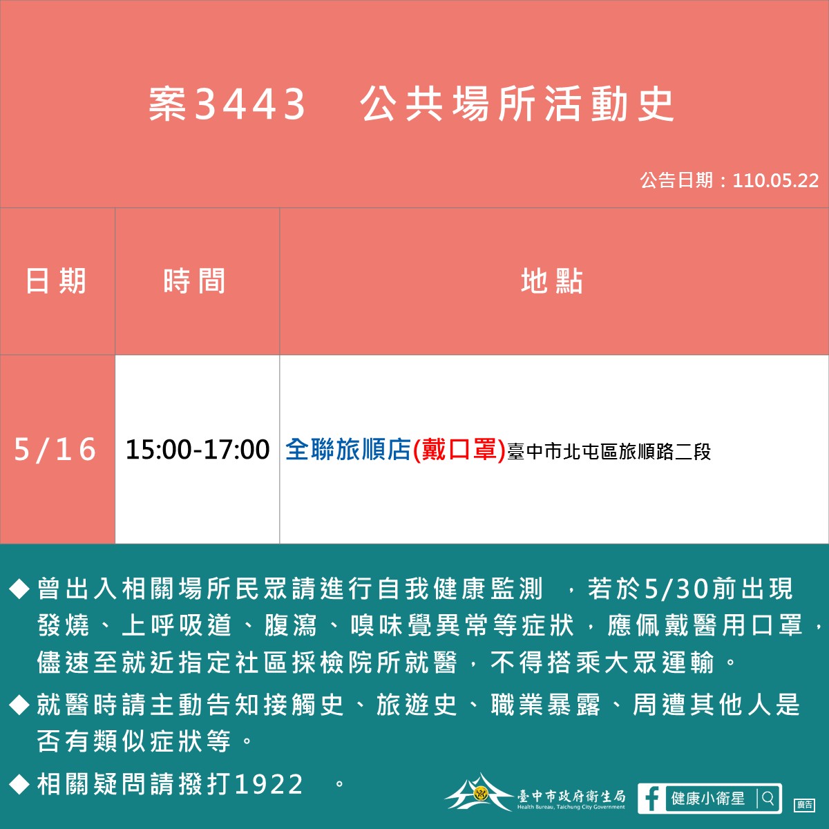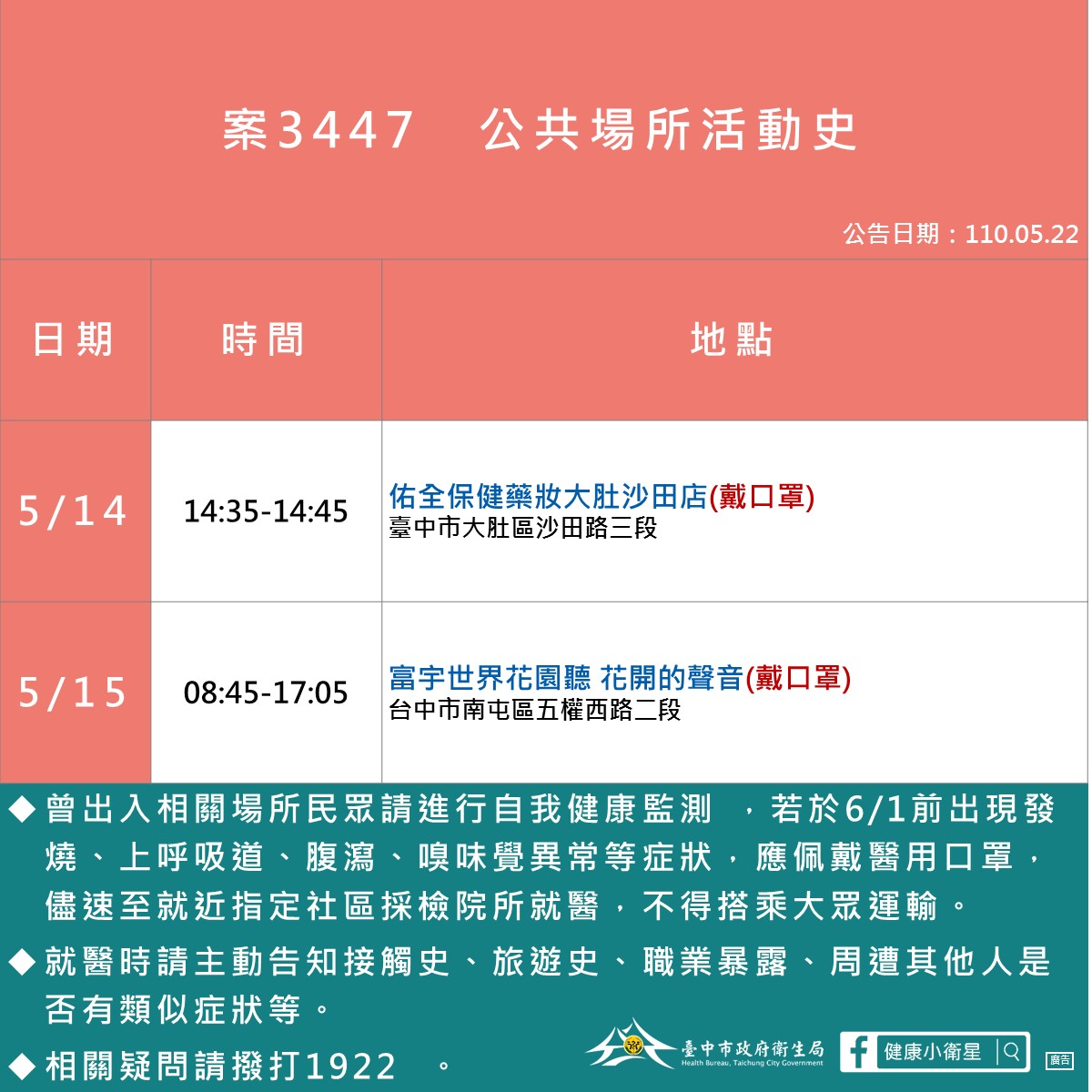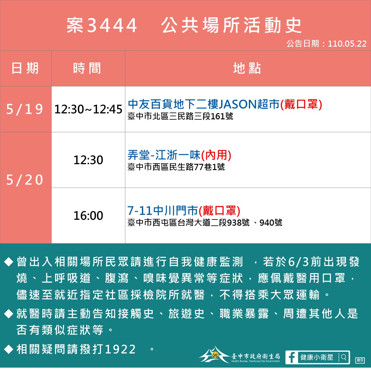 05/22台中確診足跡、公共場所地點活動史 發佈日期: 2021-05-222021-05-22 作者: tomchun ※本篇內文資訊參考如下※ - - ※更新文章日期: 2021-05-22 05/22台中確診足跡、公共場所地點活動史 – 05/22台中確診足跡、公共場所地點活動史