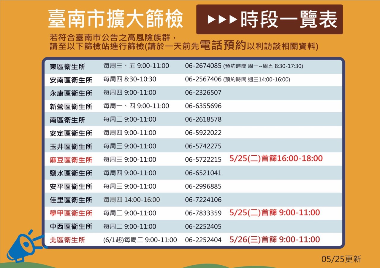 第十三站:麻豆區衛生所,本預計5/26開設,提前至今(25)日下午開始篩檢。