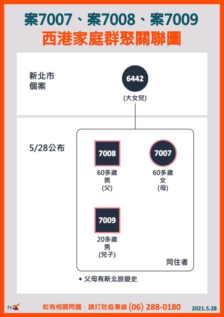 案7007與7008為60餘歲夫妻,是新北案6442之家人,在5月12至23日曾一起前往板橋,24日開始出現症狀,26日偕同無症狀的20餘歲案7009就醫採檢後三人確診。