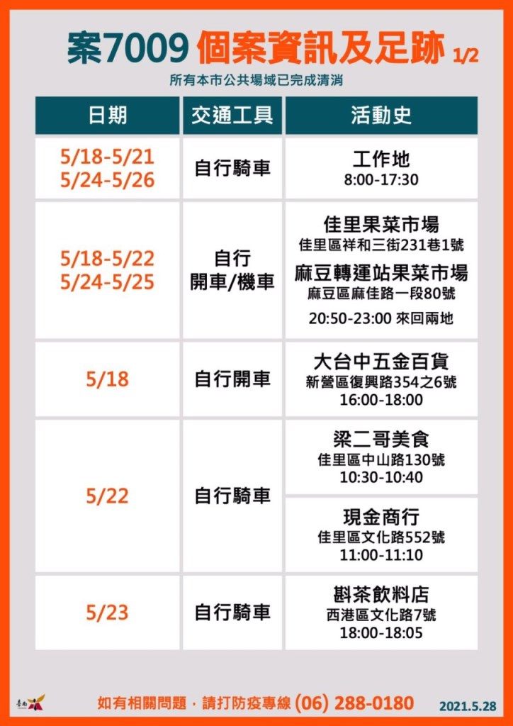 關於台中日籍教練案6350在5月到過台南一事,個案在16日開始出現輕微症狀,25日因症狀未改善,前往醫院採檢,26日確診。