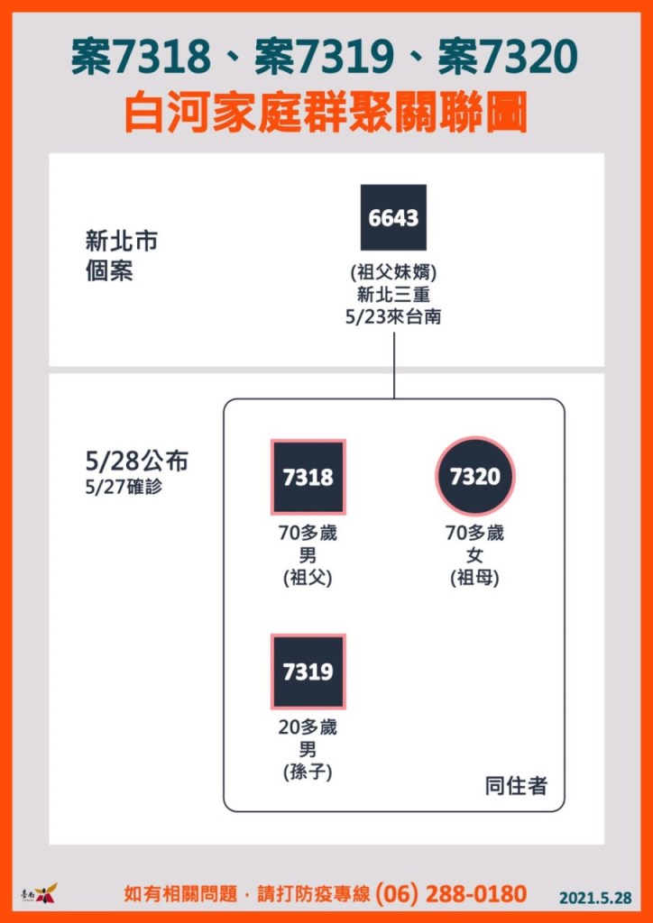 案7318、7320為70餘歲夫妻,是20餘歲案7319之祖父母,與新北案6643為親友並在23日曾經接觸,7318及7319在25日後陸續出現症狀,三人在27日至醫院採檢確診。