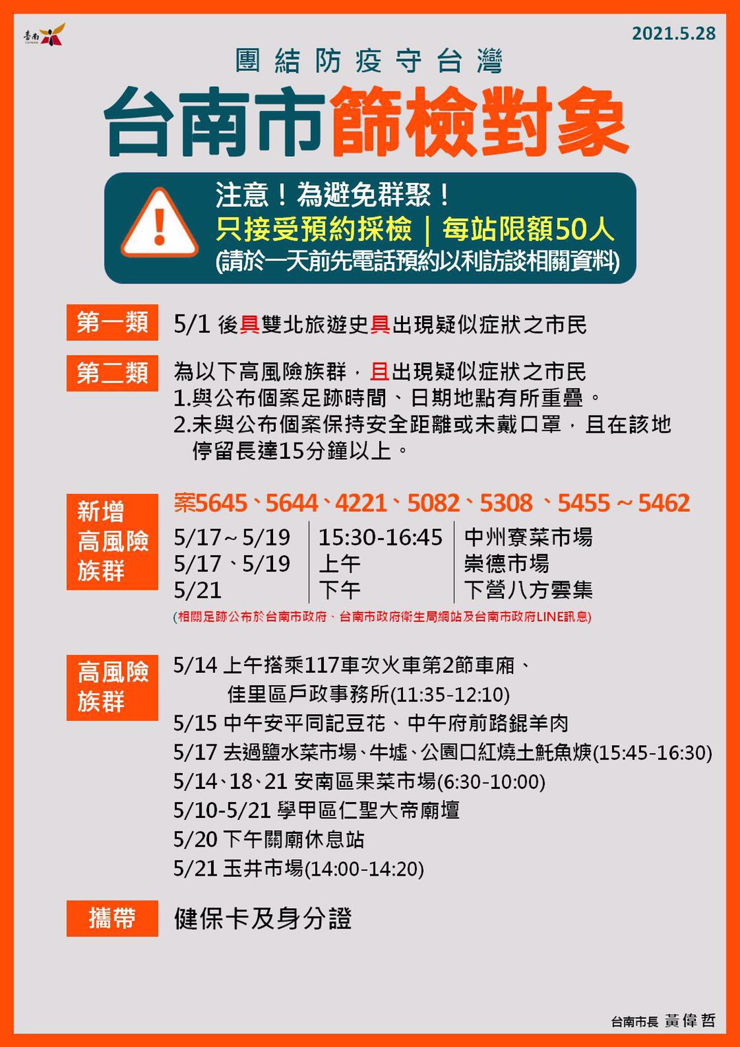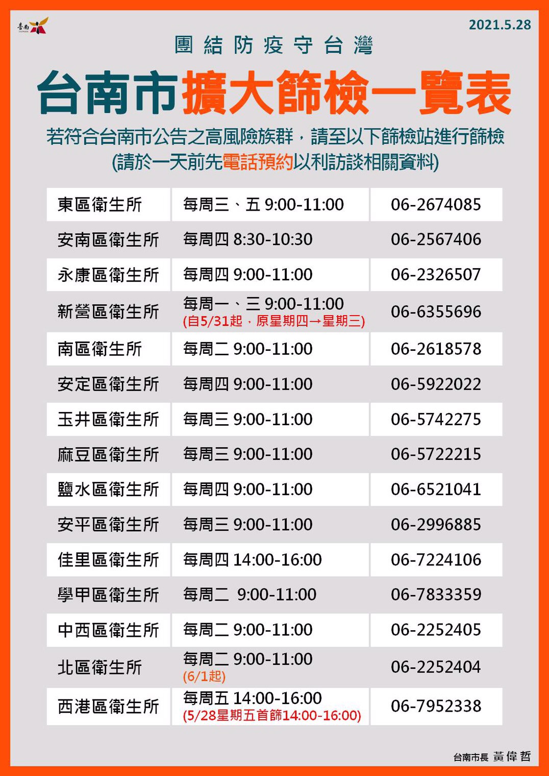 05/28台中>台南確診足跡、台南擴大篩檢衛生所一覽表