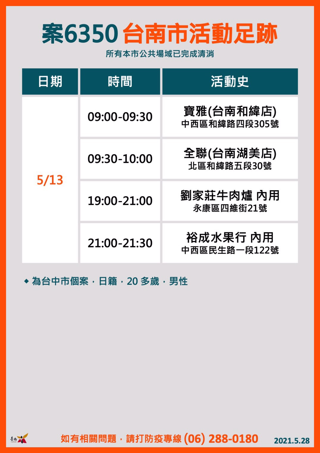 6350個案在 #5月13日 #9時到寶雅台南和緯店停留30分、#9時30分至10時到全聯台南湖美店、#19至21時到劉家莊牛肉爐、#21時到裕成水果行停留30分,上面地點皆以完成消毒清潔。