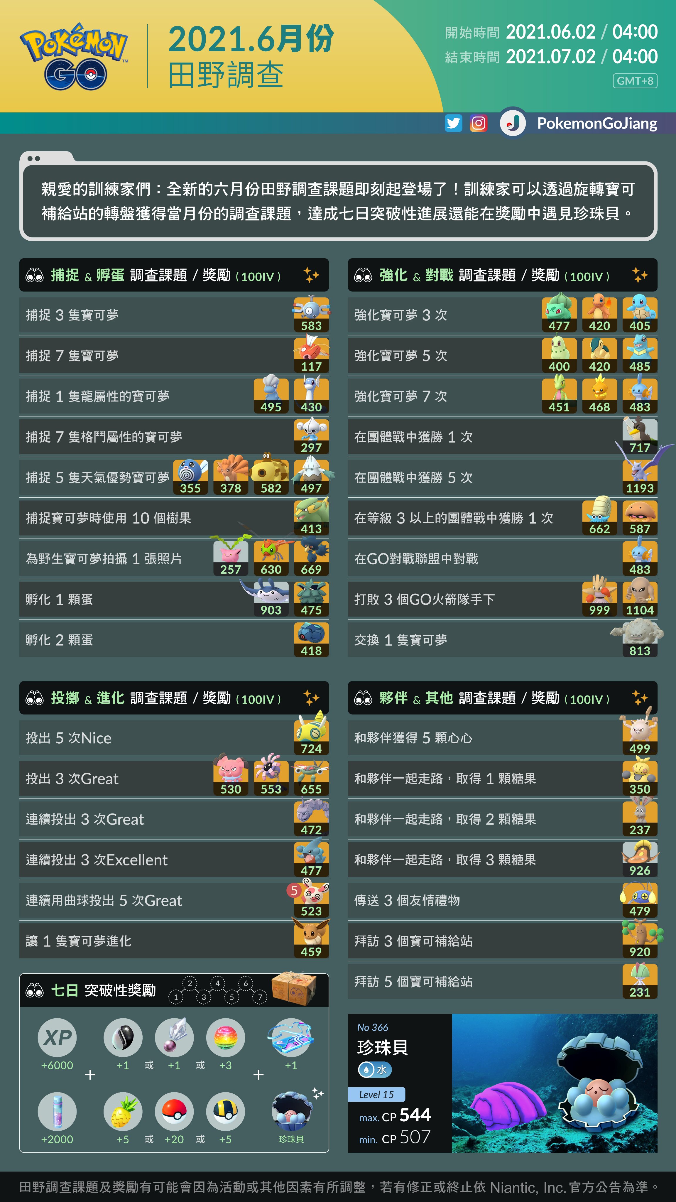 2021年6月田野任務獎勵資訊表 Pokemon GO