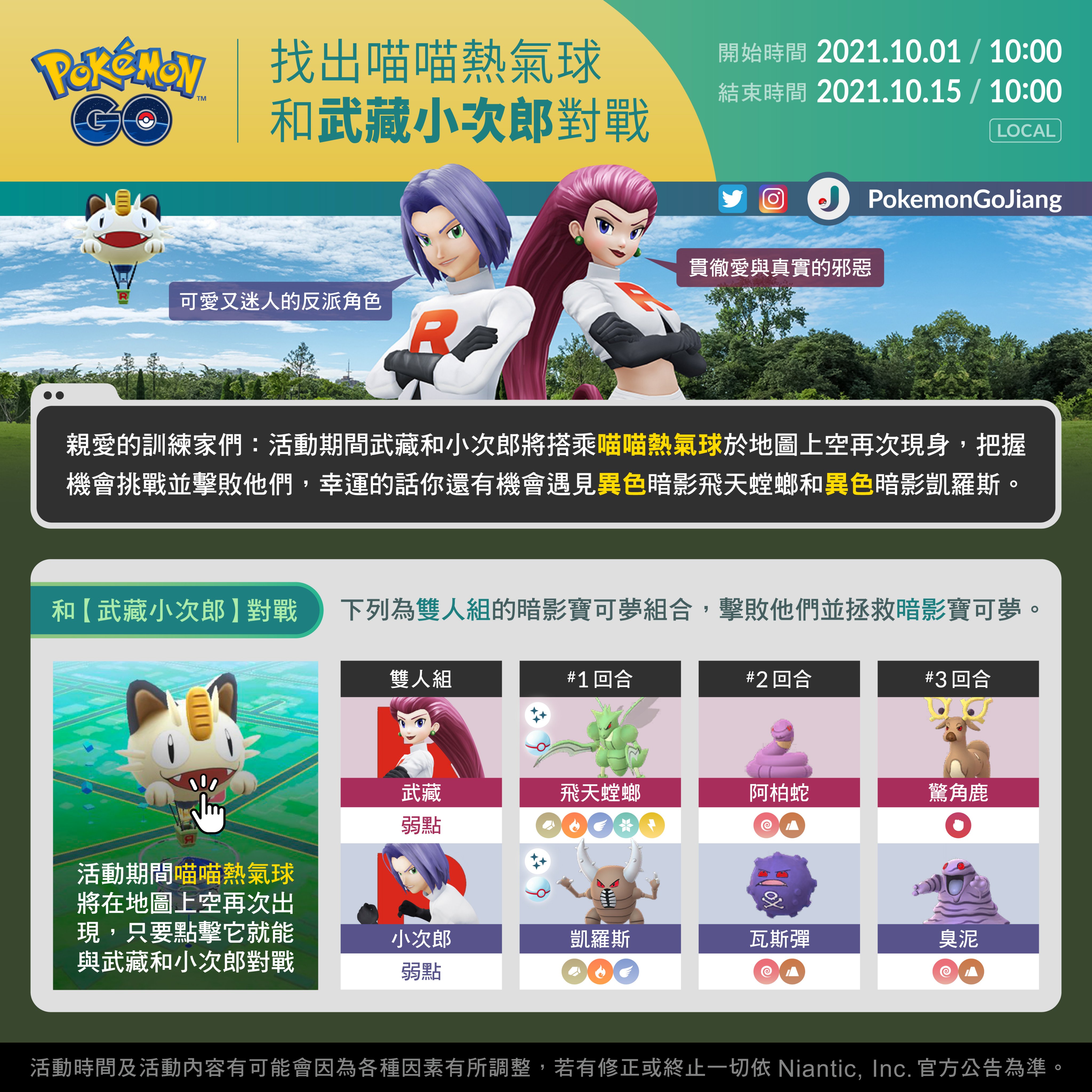 火箭隊的武藏和小次郎將再次乘著喵喵熱氣球出現,拍GO Snapshot的時候或許會有可疑人物亂入也不一定。據說他們只會待到10月15日,記得去找找看囉。