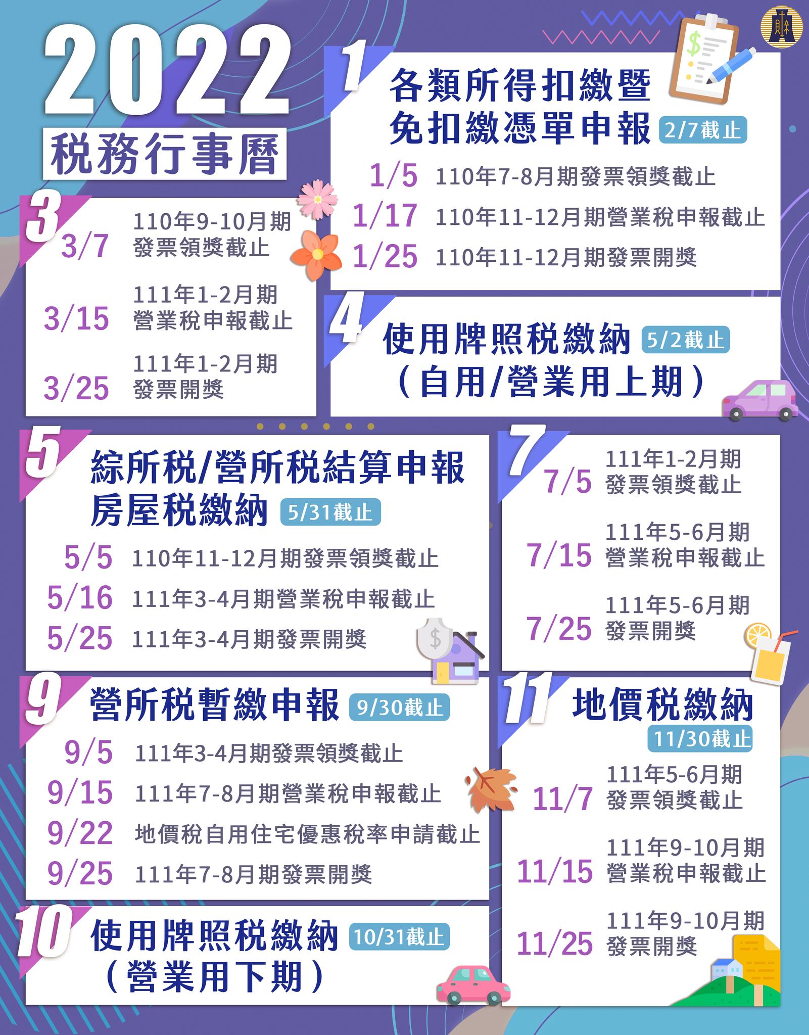 2022年稅務繳稅行事曆、所得、營所稅、地價稅、牌照稅、房屋稅