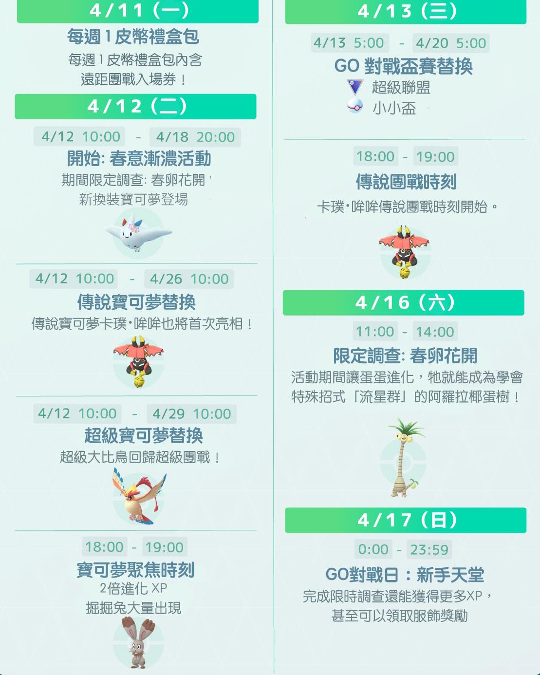 04/11~17 Pokemon GO 本週活動提醒2022 發佈日期: 2022-04-112022-04-11 作者: tomchun ※本篇內文資訊參考如下※ - - ※更新文章日期: 2022-04-11 04/11~17 Pokemon GO 本週活動提醒 – 04/11 一元禮盒 04/12 春卵花開 新活動開始 04/12 聚焦時刻 掘掘兔 04/12 五星團體戰更換頭目 卡璞・哞哞 04/12 MEGA 頭目超級大比鳥 04/13 超級聯盟 小小盃 04/13 傳說團體戰約會 04/16 春卵花開 限定調查 04/17 GO對戰日 新手天堂 –