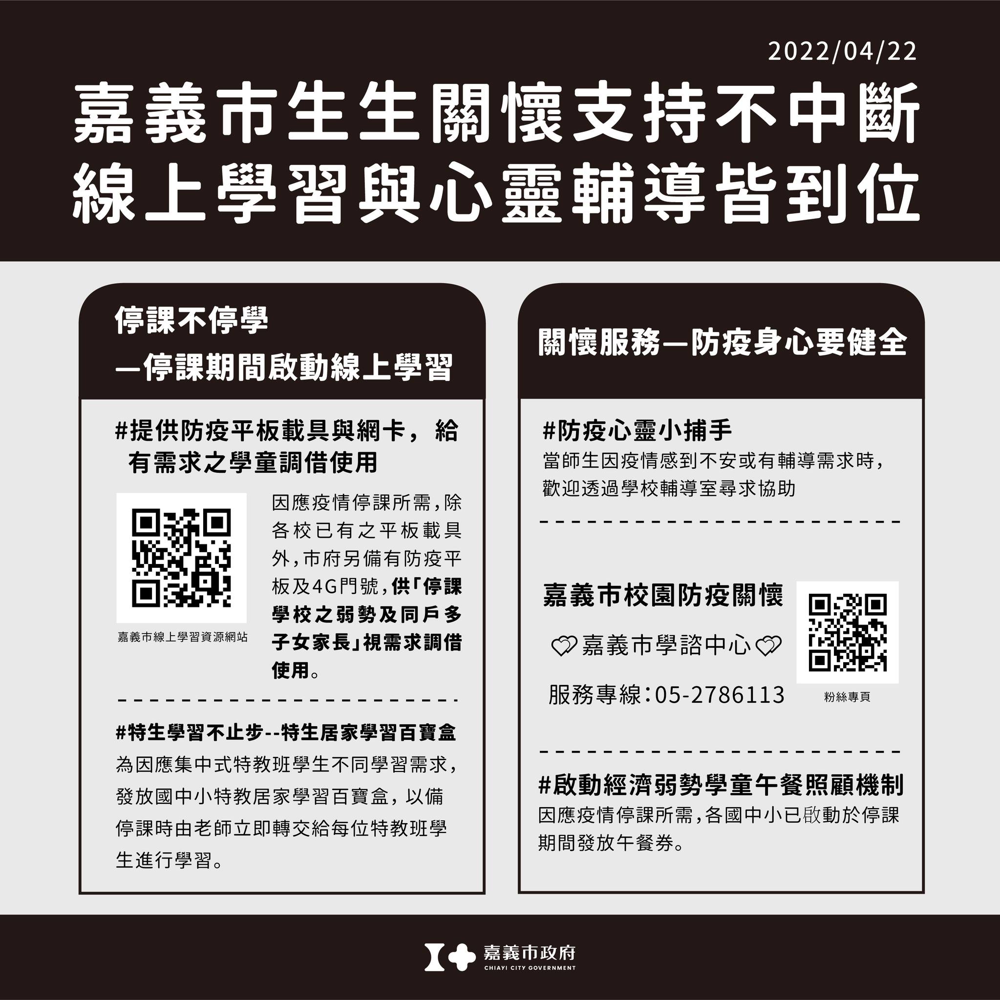 另外也結合嘉義市4大責任醫院(嘉義基督教醫院、聖馬爾定醫院、中榮嘉義分院、部立嘉義醫院)設置健康關懷中心,每天會有專人電話關心、了解確診者身體狀況,並協助相關後續的醫療處置。