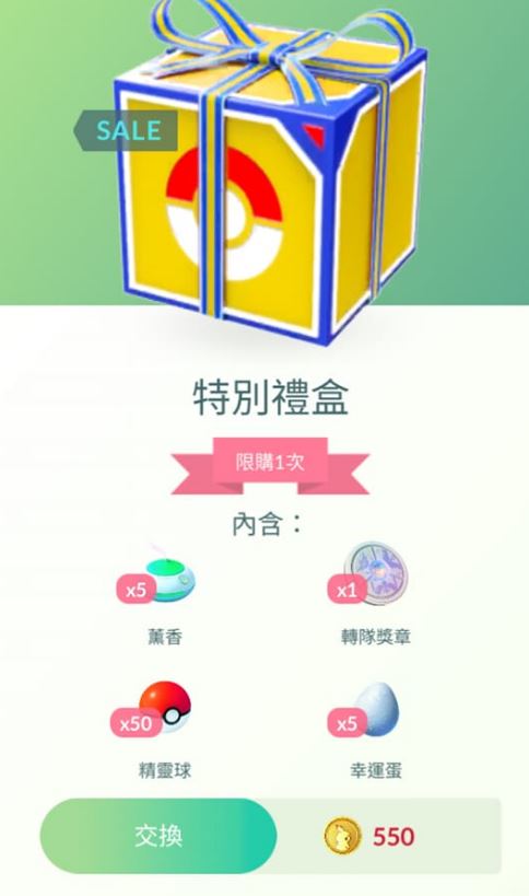 02/28 Pokemon GO 特別禮盒550皮幣 2023 發佈日期: 2023-02-282023-02-28 作者: tomchun ※本篇內文資訊參考如下※ - - ※更新文章日期: 2023-02-28 02/28 Pokemon GO 特別禮盒 2023 – 商店出現特別禮盒 限購一次 特別的是轉隊獎章特價! 好像可以來轉一下隊伍? 薰香*5 轉隊獎章*1 紅球*50 幸運蛋*5 – –