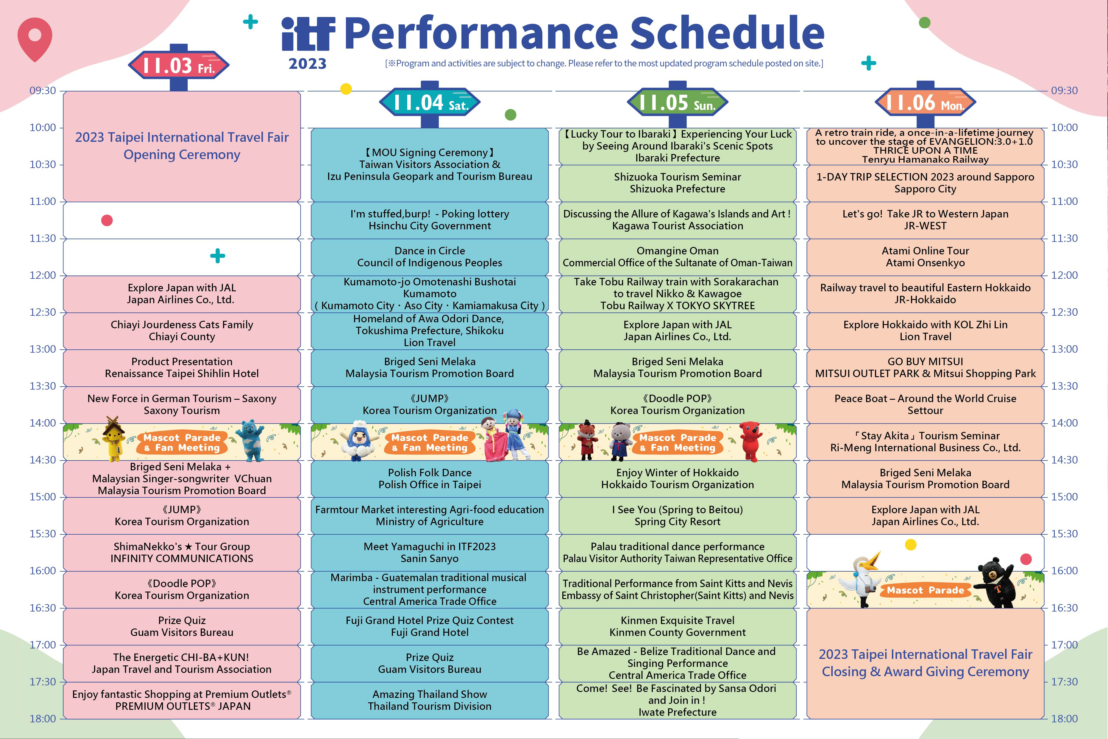 國內外超夯吉祥物大遊行、同台賣萌較勁,還有各國精彩表演、有獎徵答、最新旅遊資訊分享活動等,揪大小朋友們一起HIGH翻全場,歡慶嘉年華!ITF台北國際旅展誠摯邀請各位一同來逛旅展、探索旅行新知、欣賞精彩活動,今年11/3-11/6就在南港展覽館等您喔!
