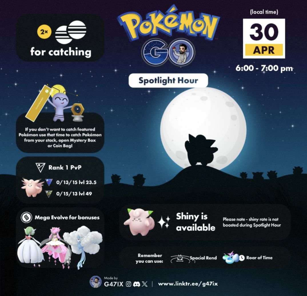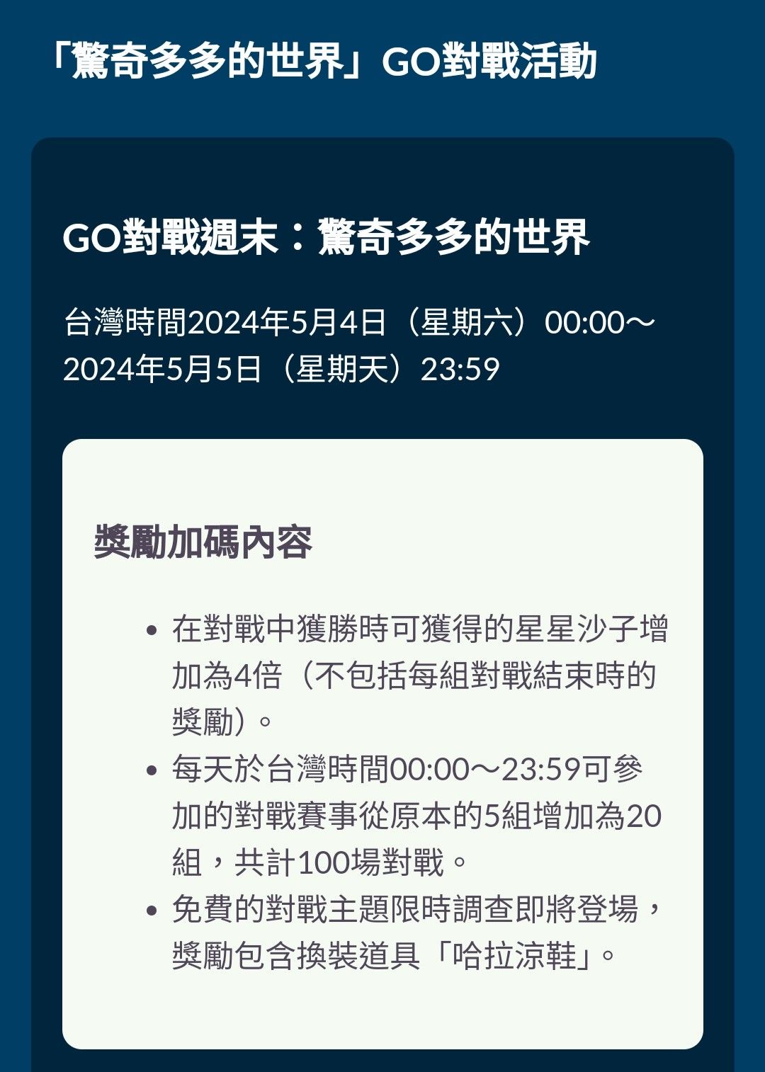04/29本週活動提醒Pokemon GO 2024 發佈日期: 2024-04-292024-04-29 作者: tomchun ※本篇內文資訊參考如下※ - - ※更新文章日期: 2024-04-29 04/29本週活動提醒Pokemon GO 2024 – 04/30 皮皮聚焦時刻 05/01 團體戰約會 05/01 粉紅光輝特殊調查任務 05/02 新BOSS團體戰 05/04 勁敵週活動 – – – 每週時時刻刻獎勵表 – – – – – –