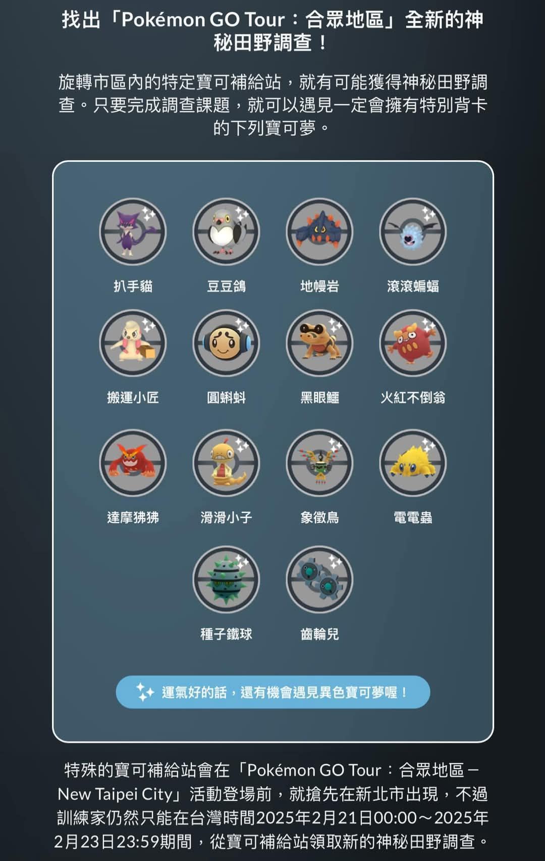 l 《Pokémon GO Tour:合眾地區》活動官方網站:https://gotour.pokemongolive.com/newtaipeicity/
