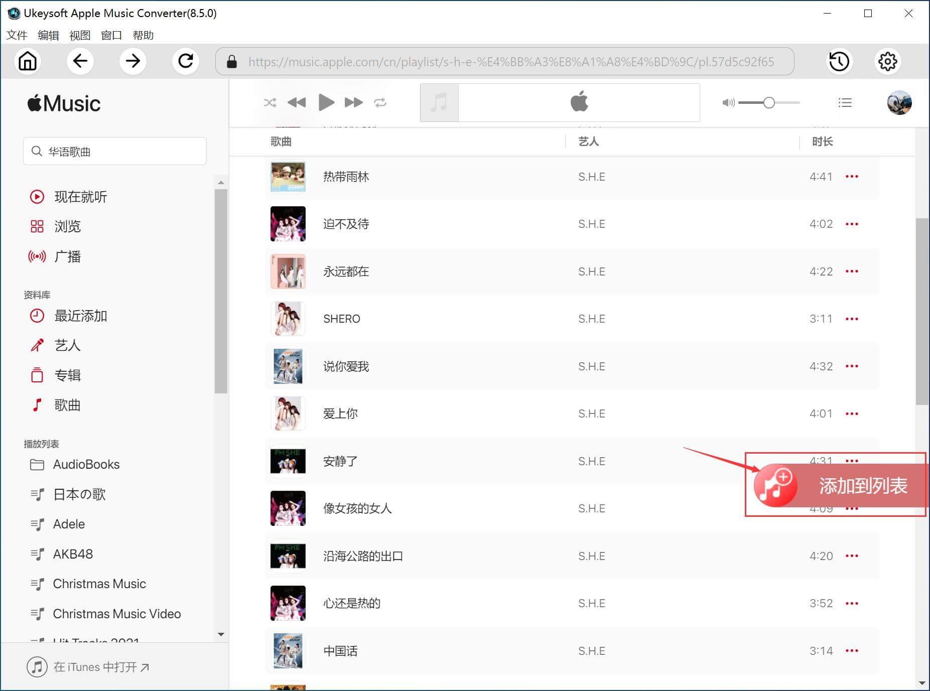 完成輸出設置後,您需要直接轉換Apple Music播放清單或專輯。您也可以在搜索欄搜索您喜歡的歌曲、藝人和專輯。點擊右下角的【添加到列表】按鈕將該播放清單的所有曲目添加到待轉列表。