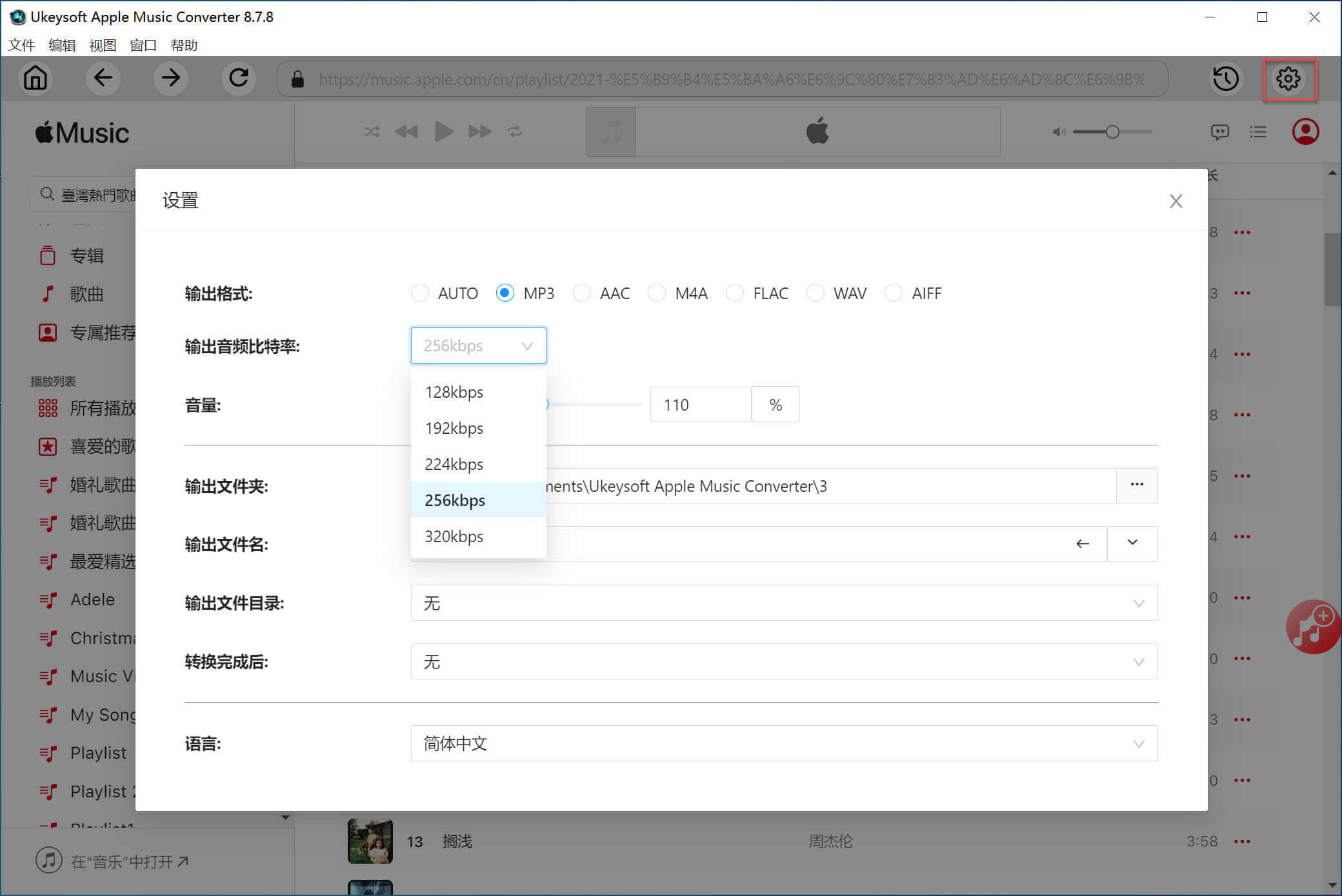 點擊軟體右上角的「齒輪」圖標,就會彈出設置菜單,您可以選擇MP3、M4A、AAC、WAV、FLAC和AIFF作為輸出格式,其中無損M4A是軟體的預設輸出格式。小編建議你選擇MP3作為輸出格式以適應任何播放機。