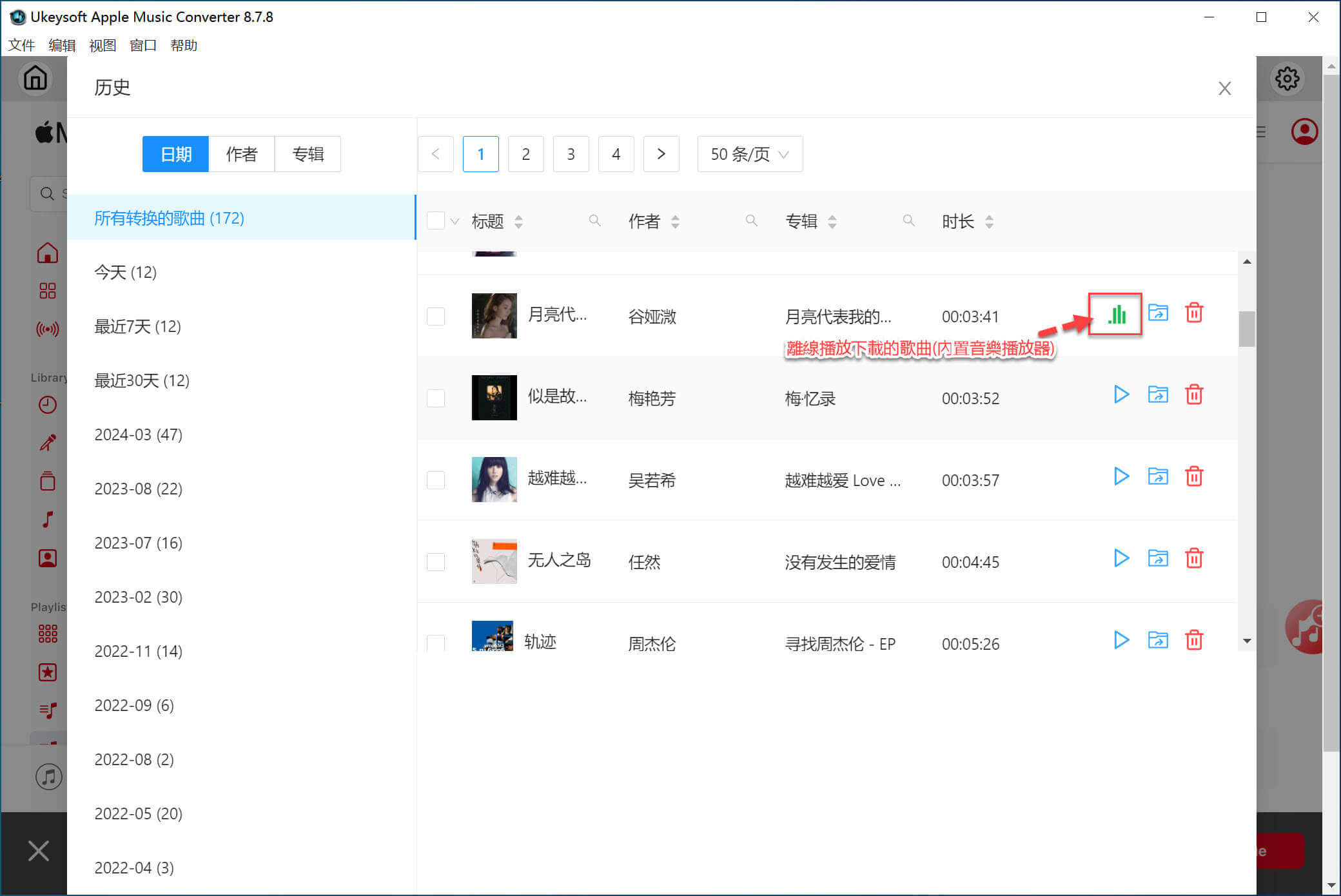 或者,點選右上角的「鬧鐘」圖標,軟體會自動打開其內建的音樂管理器/音樂播放機,在這裡您就能看見所有下載完成的歌曲了,所有下載的Apple Music 音樂會按轉換日期、藝術家或專輯自動分類好了,非常方便用戶管理音樂庫,您可以使用軟體內置的音樂播放機播放下載的歌曲,無需使用iTunes或Apple Music App。