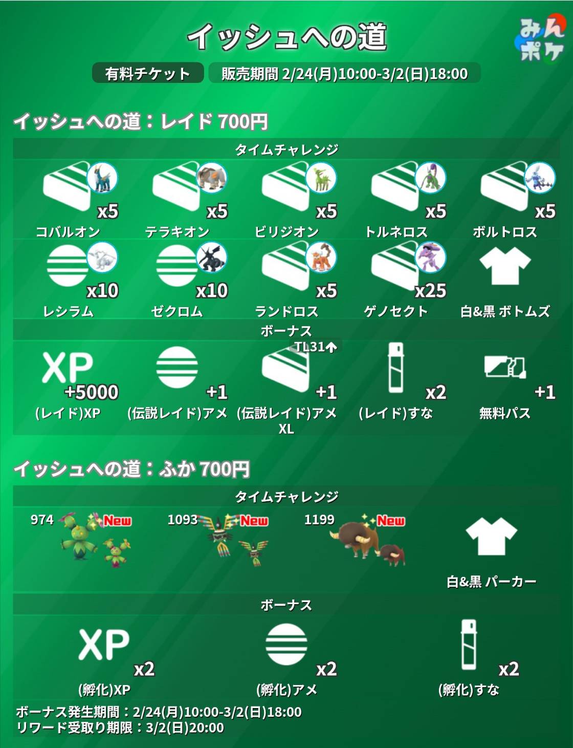 本次活動的2種入場券將於台灣時間2025年2月24日早上10:00起到2025年3月2日下午18:00期間開放販售,2種入場券皆包含限時任務課題與獎勵加碼內容,訓練家可以選擇購買任一入場券,或是同時購入2種入場券。