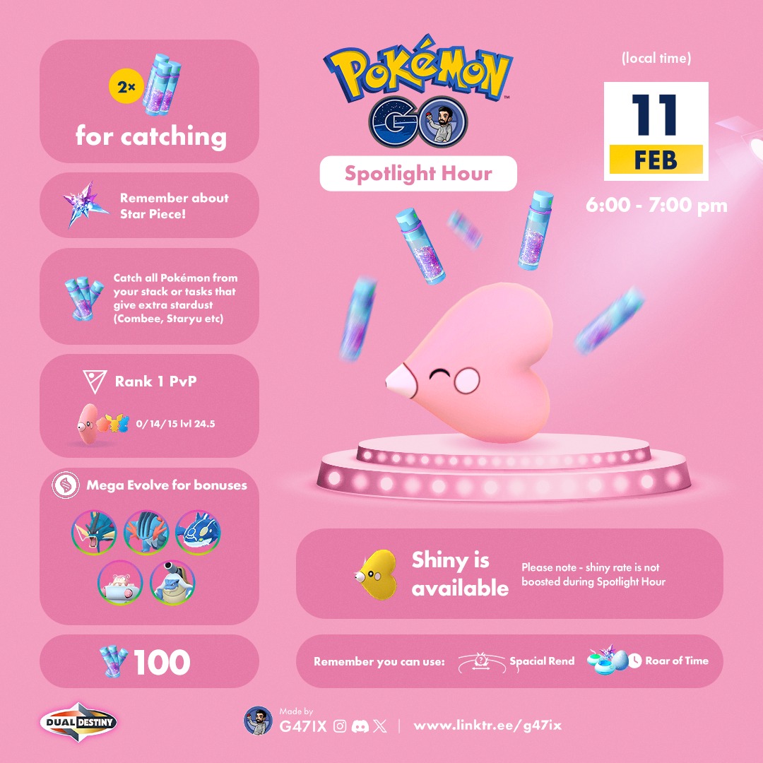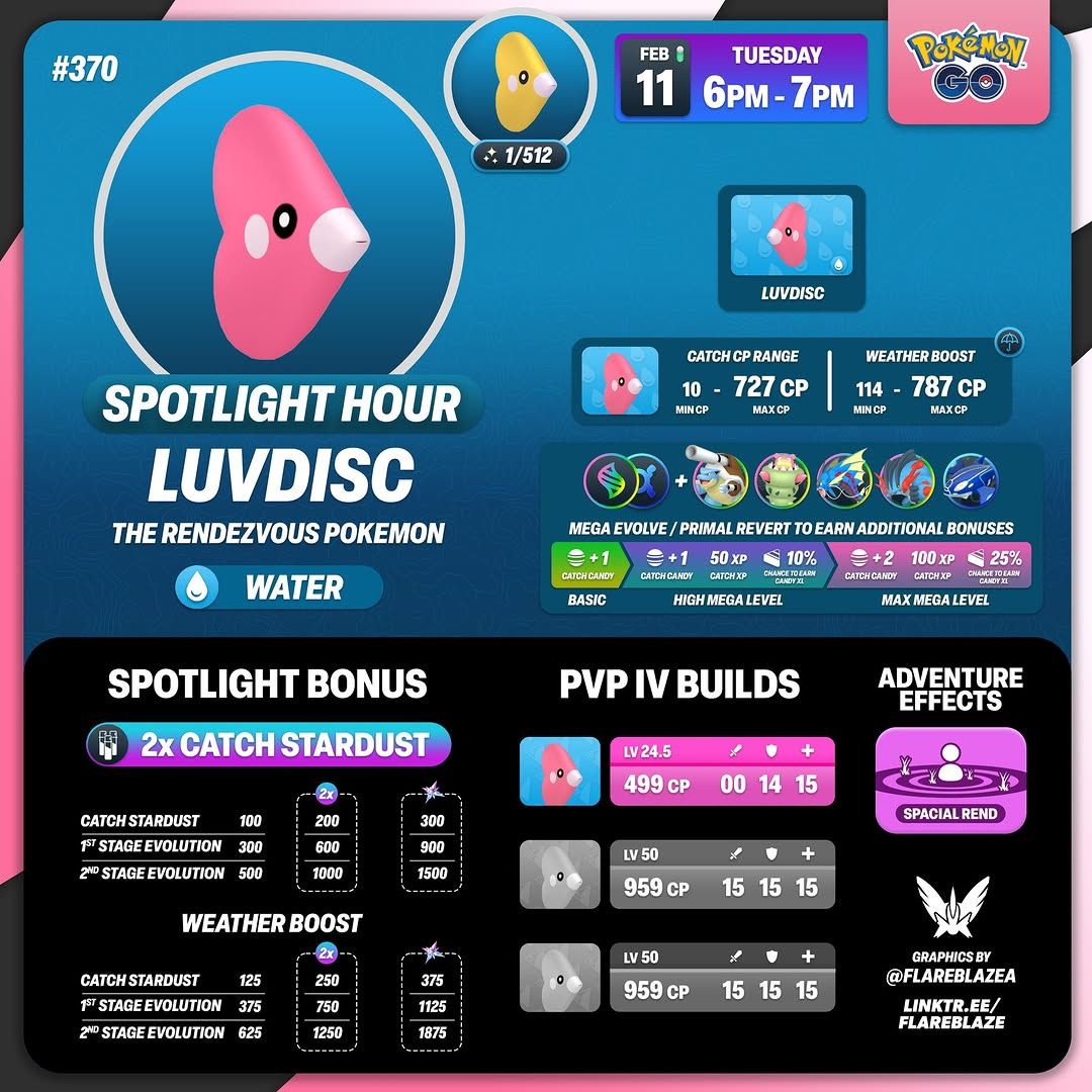 02/11 愛心魚聚焦時刻 Pokemon GO 2025 發佈日期: 2025-02-102025-02-11 作者: tomchun ※本篇內文資訊參考如下※ - - ※更新文章日期: 2025-02-11 02/11 愛心魚聚焦時刻 Pokemon GO 2025 – ▲2/11日18:00點~19:00 聚焦時刻主角寶可夢:愛心魚 獎勵:捕捉寶可夢2倍星塵 – – – – Gen3_L1-L40 IV100_#370 愛心魚 Luvdisc – Gen3_L15+20+25_#370 愛心魚 Luvdisc – –