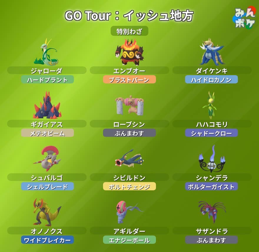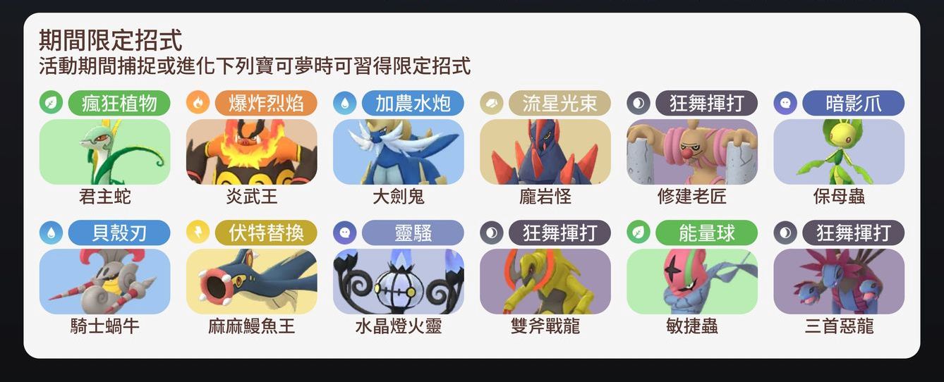 活動進化限定招式寶可夢列表 2025 Pokémon GO Tour:合眾地區-New Taipei City 新北市 發佈日期: 2025-02-222025-02-22 作者: tomchun ※本篇內文資訊參考如下※ - - ※更新文章日期: 2025-02-22 活動進化限定招式寶可夢列表 2025 Pokémon GO Tour:合眾地區-New Taipei City 新北市 – 活動期間,進化或捕捉到以下寶可夢,可以得到限定招式 – 君主蛇、炎武王、大劍鬼、龐岩怪、修建老匠、保母蟲 騎士蝸牛、麻麻鰻魚王、水晶燈火靈、雙斧戰龍、敏捷蟲、三首惡龍 – – – – #PokémonGO #PokemonGOTour – –