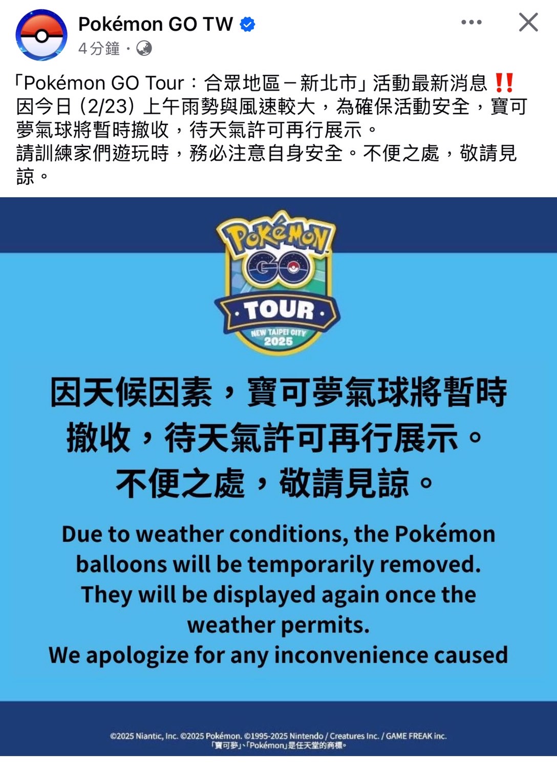 02/23「Pokémon GO Tour:合眾地區-新北市」活動最新消息 Pokemon GO 2025 發佈日期: 2025-02-232025-02-23 作者: tomchun ※本篇內文資訊參考如下※ - - ※更新文章日期: 2025-02-23 02/23「Pokémon GO Tour:合眾地區-新北市」活動最新消息 Pokemon GO 2025 – 「Pokémon GO Tour:合眾地區-新北市」活動最新消息‼️ 因今日(2/23) 上午雨勢與風速較大, 為確保活動安全, 寶可夢氣球將暫時撤收, 待天氣許可再行展示。 請訓練家們遊玩時, 務必注意自身安全。 不便之處,敬請見諒。 – – #PokémonGO #PokemonGOTour – –