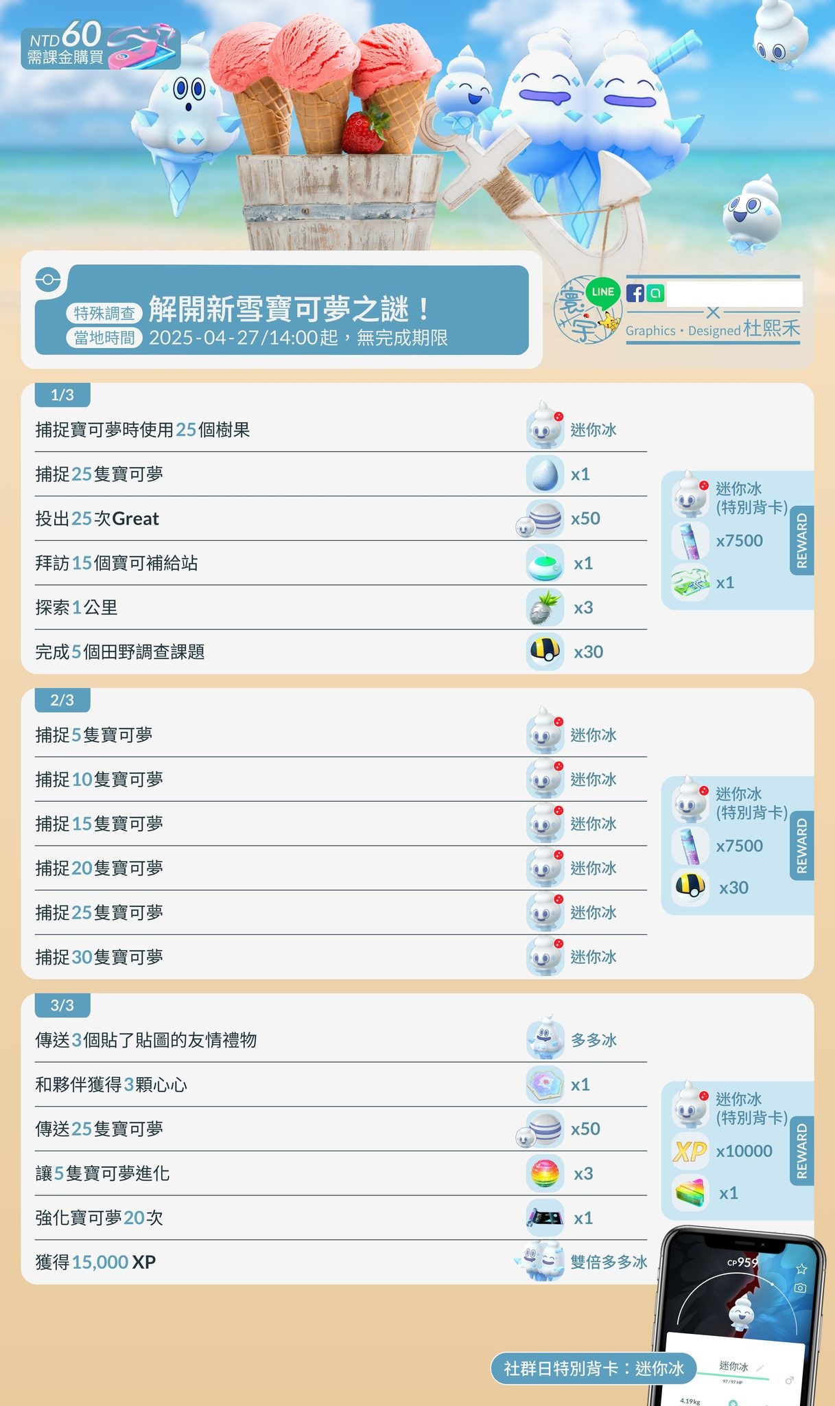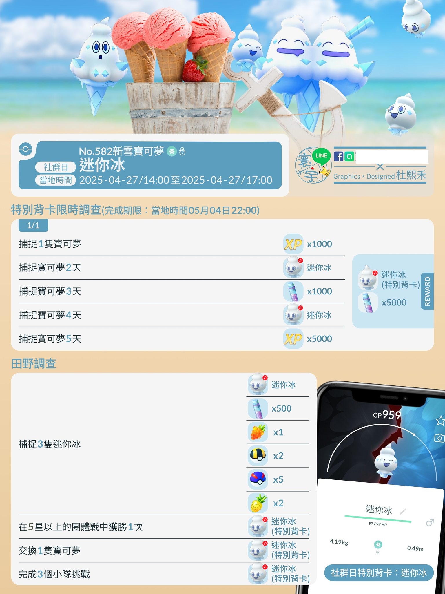 運氣好的話,與在地社群一起出門GO的時候還能領取到特殊的田野調查,並於完成後遇見擁有「強大與極致」特別背卡的「迷你冰」喔!