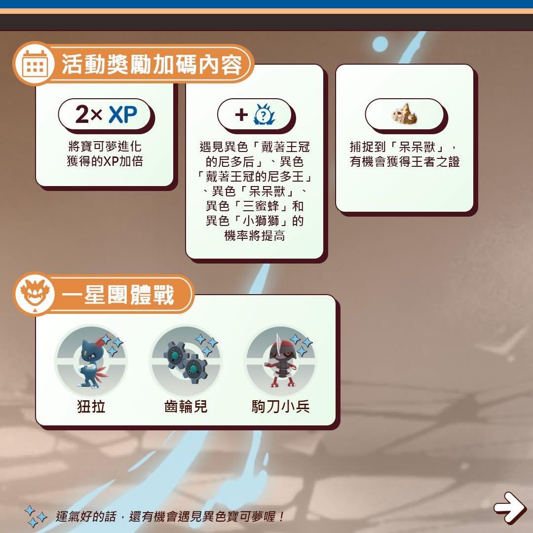 ❷遇見異色戴著王冠的尼多后、異色戴著王冠的尼多王、異色呆呆」、異色三蜜蜂和異色小獅獅機率將提高