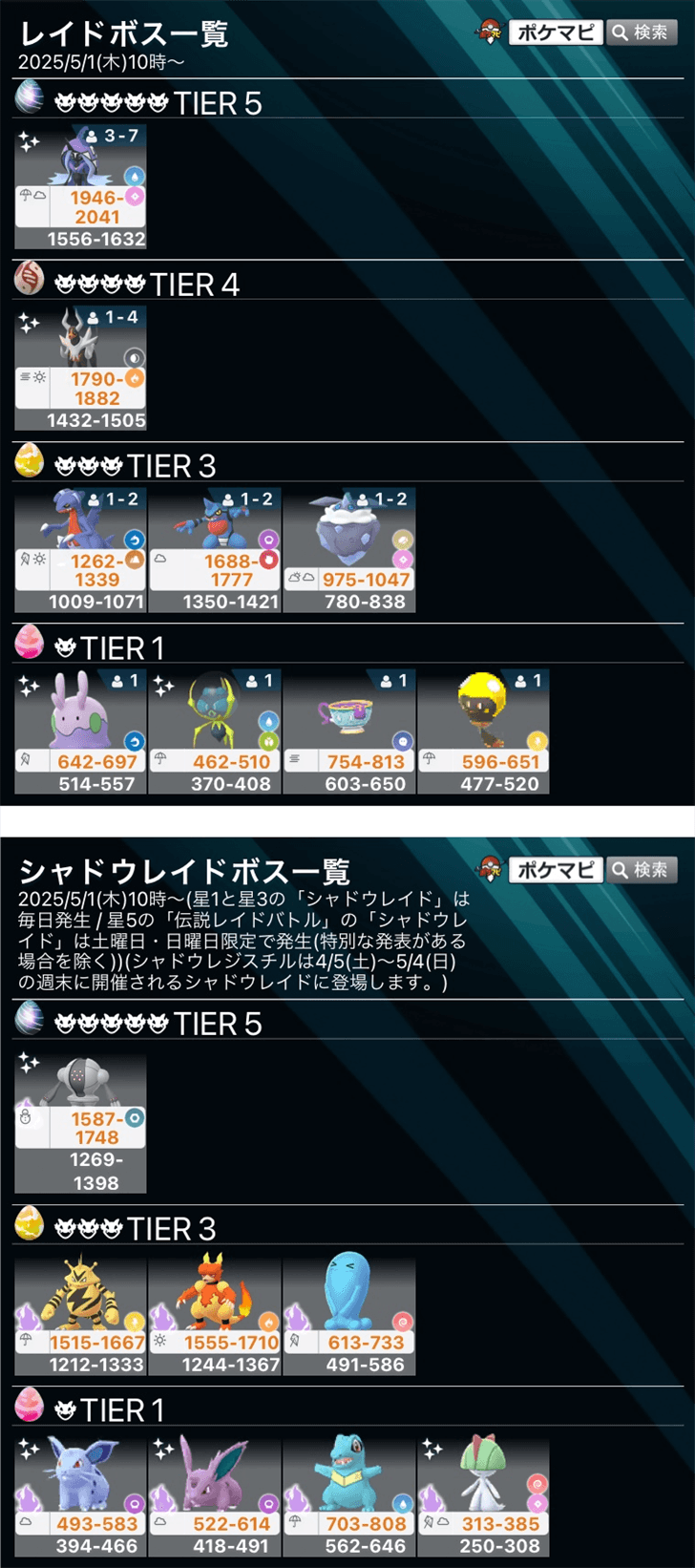 頭目表、一星、二星、三星、四星、五星、MEGA頭目、各星頭目更新、暗影團體戰 (假日限定)、最新孵蛋表、暗影頭目寶可夢