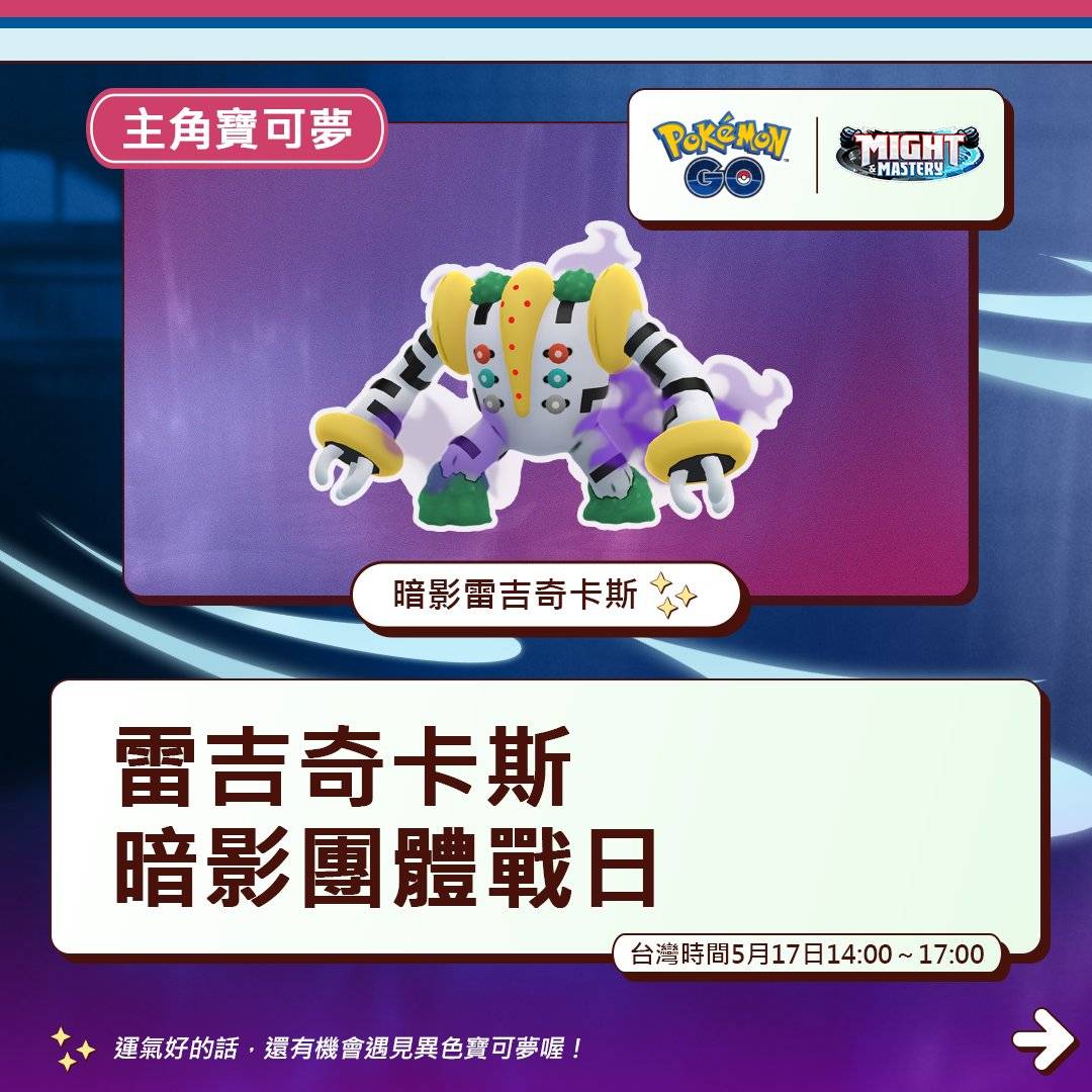 參與《Pokémon GO》的暗影團體戰活動,從GO火箭隊的手中解救「暗影雷吉奇卡斯」吧!暗影團體戰將於台灣時間5月17日14:00~17:00登場。