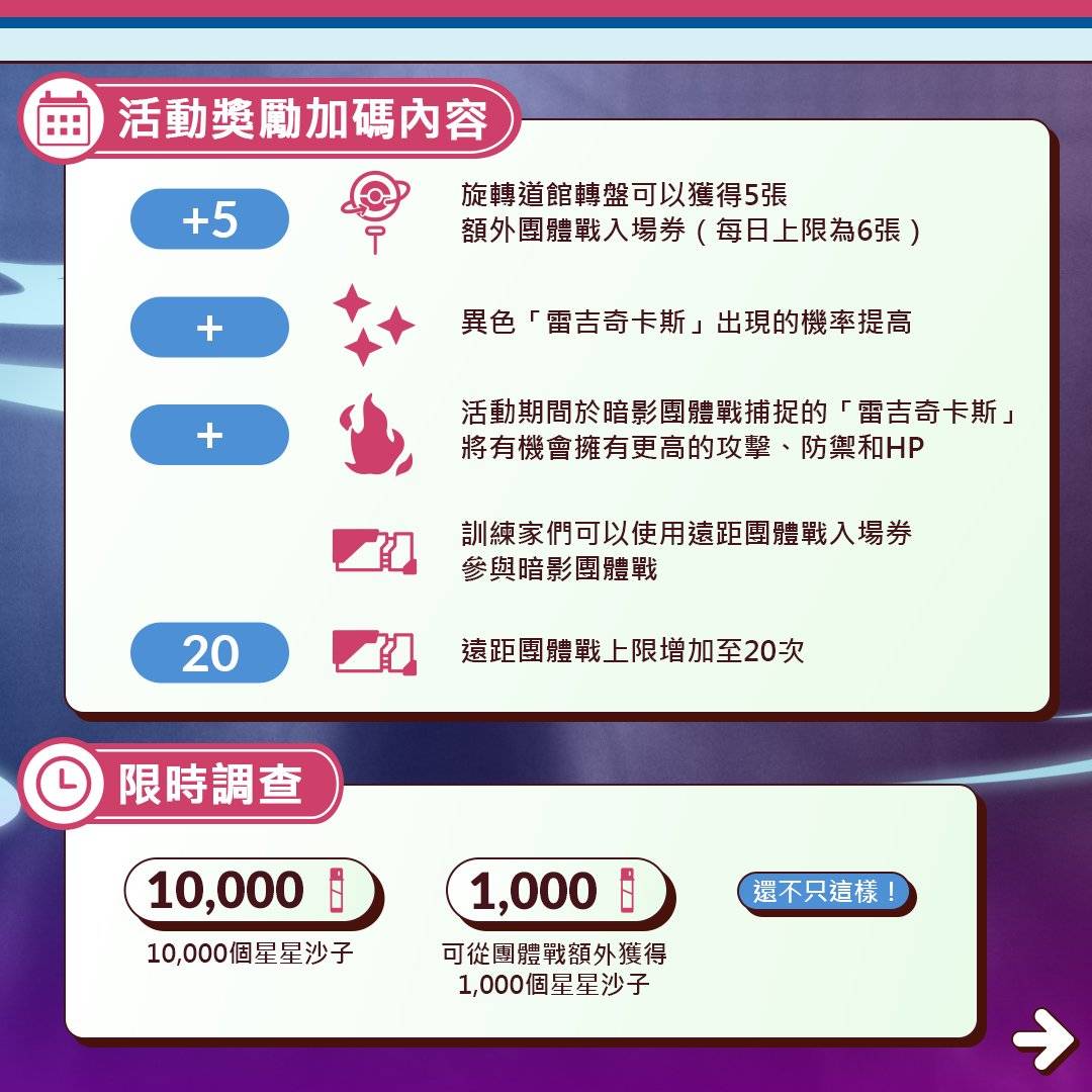 活動期間於暗影團體戰捉到的「雷吉奇卡斯」將有機會擁有更高的攻擊、防禦和HP。