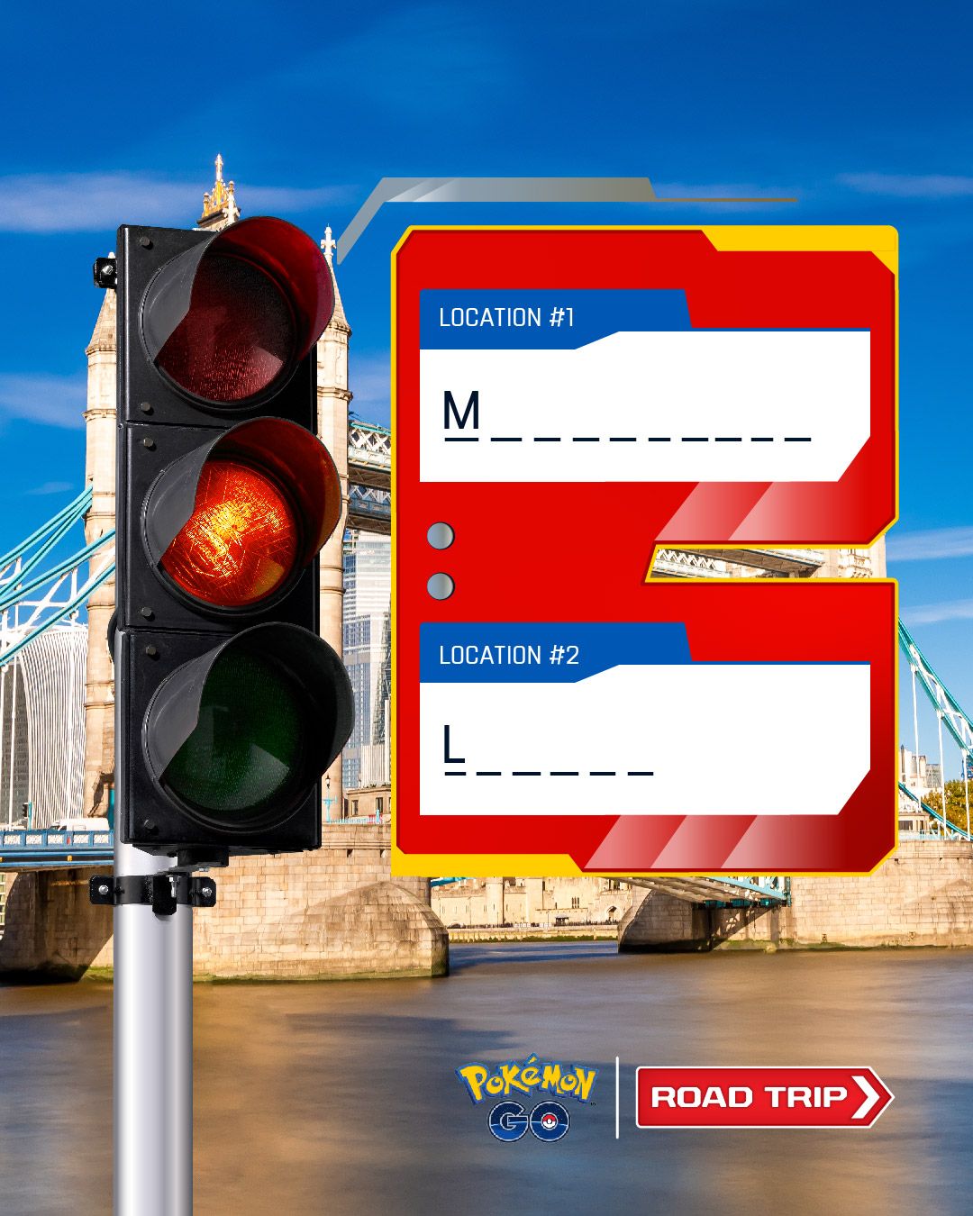 這些圖片看起來像是一個「寶可夢GO公路旅行」(Pokémon GO Road Trip) 主題的猜地名遊戲。根據圖片中的地標和字母提示,答案如下: